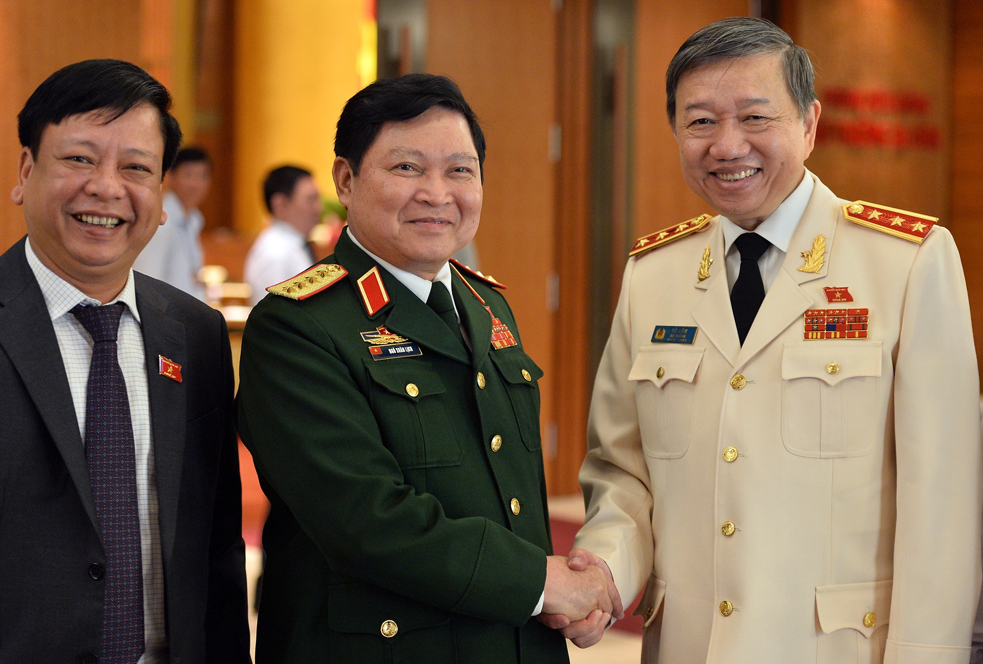 | Bộ trưởng Quốc phòng Ngô Xuân Lịch và Bộ trưởng Công an Tô Lâm sau lễ công bố kết quả kiểm phiếu. Ảnh: Hoàng Hà.