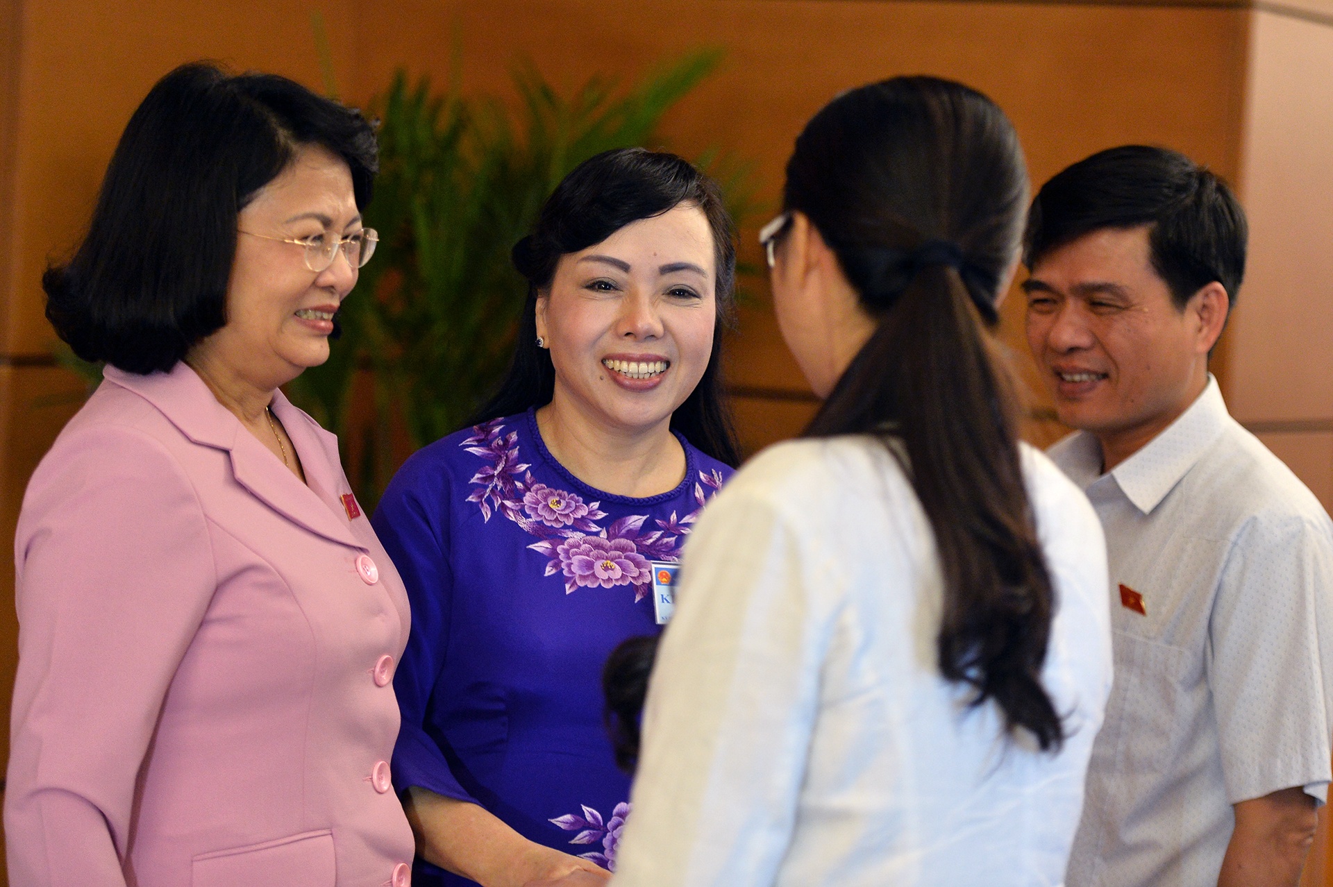 | Các đại biểu chia vui với Bộ trưởng Y tế Nguyễn Thị Kim Tiến, thành viên nữ duy nhất của Chính phủ nhiệm kỳ 2016 - 2021. Ảnh: Hoàng Hà.