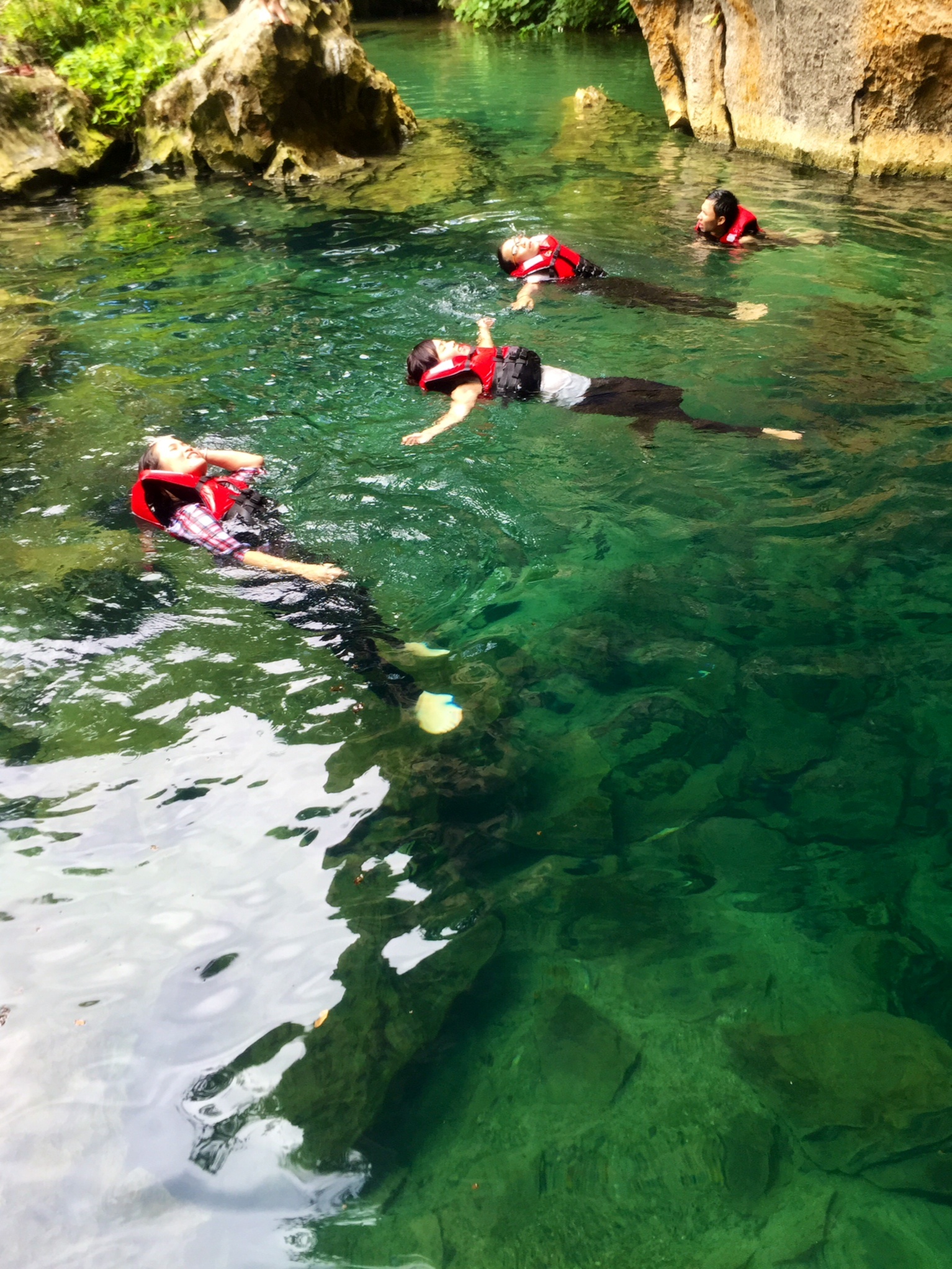 Sau khoảng 4 km trekking, ai nấy đều đã thấm mệt. Nhưng cũng là lúc chúng tôi đến với hang E, còn gọi là hang Thủy Cung. Từ xa, hang E gây ấn tượng mạnh mẽ với một màu nước xanh như ngọc, xanh đến nhức mắt, êm đềm giữa bốn bề vách đá, rừng cây. Tất cả đều phải trầm trồ trước một “hồ bơi tự nhiên” tuyệt đẹp của tạo hóa.