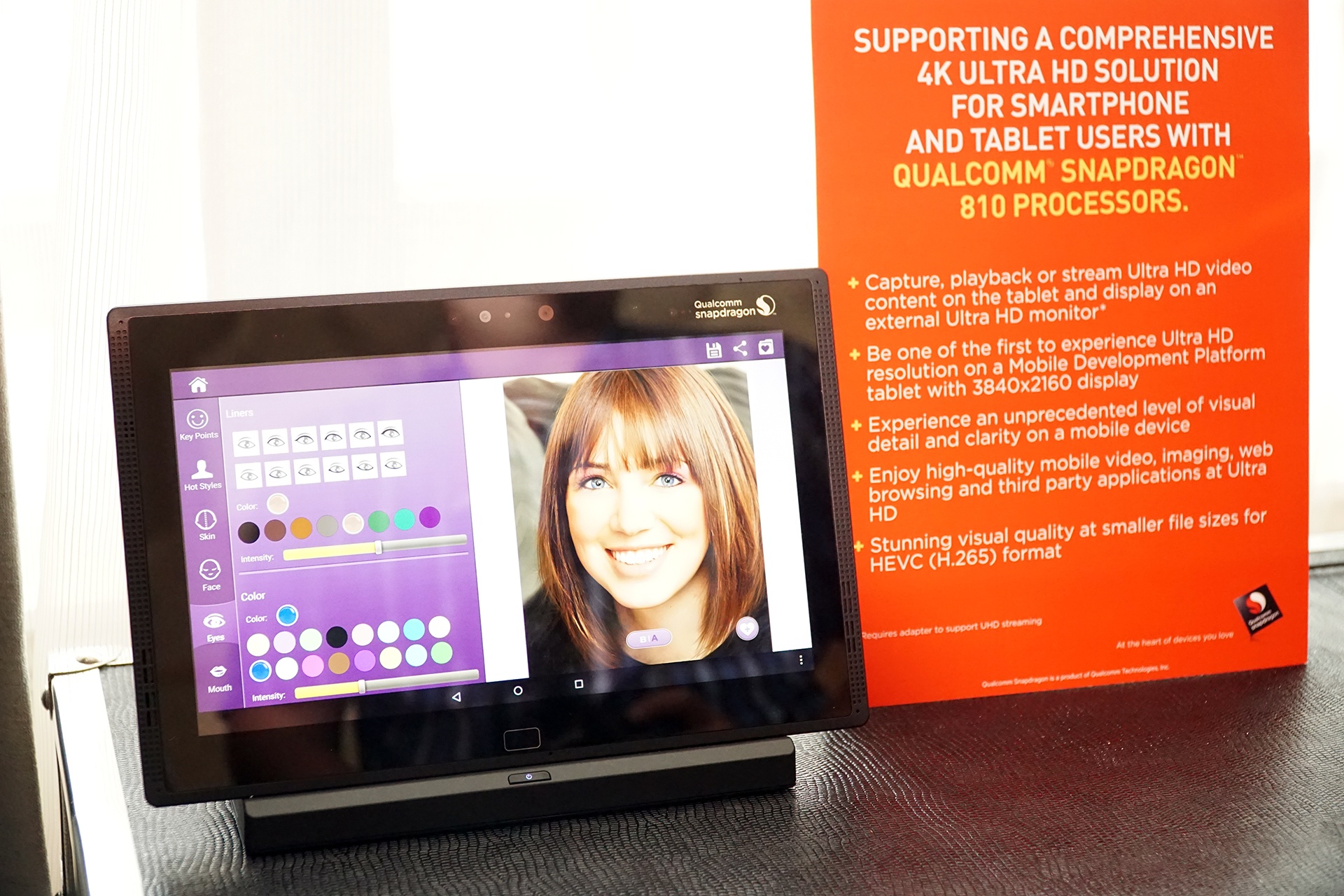 | Tương tự như trên TV, Snapdragon 810 trên tablet cũng giúp người dùng xem trực tuyến nội dung 4K với chất lượng hình ảnh cao nhưng dung lượng tải về vẫn ở mức thấp. GPU tích hợp trên dòng chip này là Adreno 430, mang lại sức mạnh đồ họa cao hơn 30% và tiết kiệm điện năng hơn 20% so với GPU Adreno 420. |