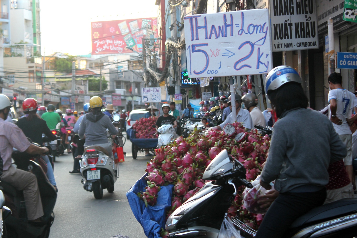 | Trên đường Phan Đình Phùng (quận Phú Nhuận), những chiếc xe chất đầy thanh long bán với giá 15.000 đồng/2 kg thu hút nhiều người mua. |