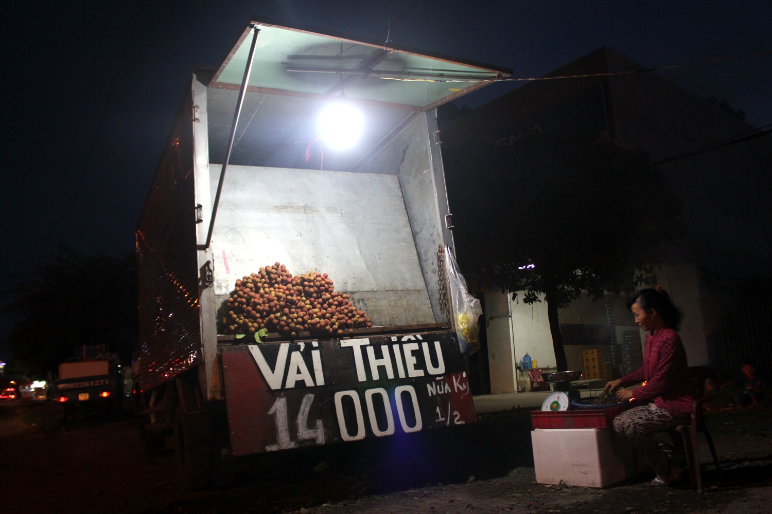 | Chị Cẩm Tú, chủ một xe tải bán vải thiều trên đường Nguyễn Văn Linh cho biết, mỗi ngày, chị bán được 18-20 thùng vải lấy từ chợ đầu mối Thủ Đức. Giá gốc là 380.000 đồng một thùng 22 kg. Bán ra với giá 28.000 đồng/kg, mỗi ngày chị Tú cũng thu một khoản lãi tương đối. Tuy nhiên, công việc này khá vất vả, chị phải bán từ 6h đến 22h mới hết hàng. |