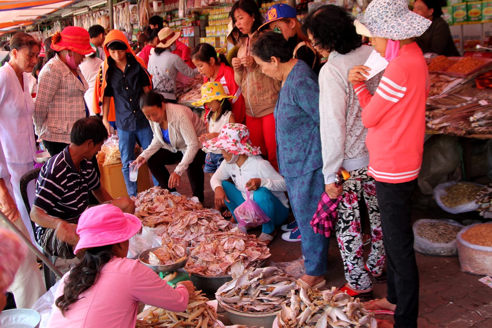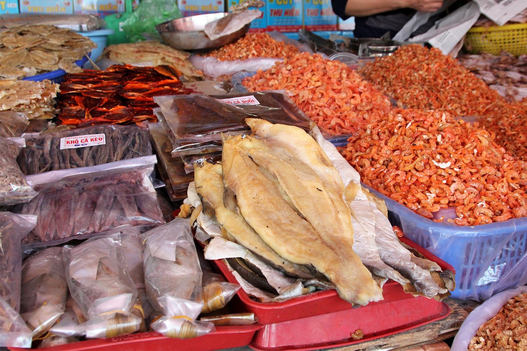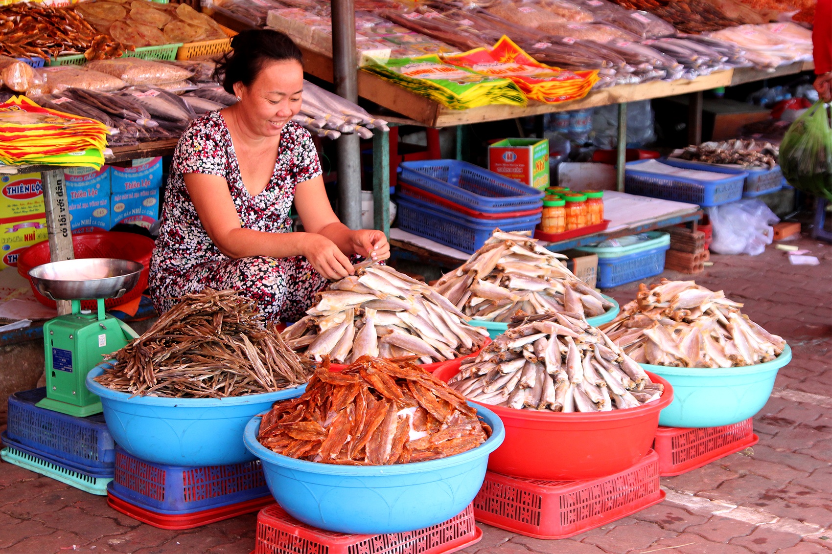 | Nhiều làng làm cá khô ở Vũng Tàu là nơi cung cấp nguồn hàng hải sản khô thường xuyên cho khu chợ này. |