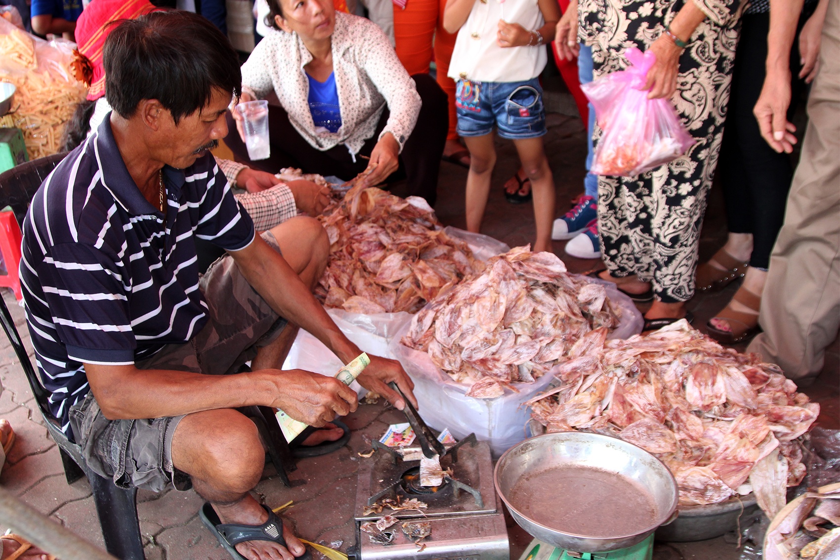 Để đảm bảo mực "xịn", các gian hàng thường có sẵn bếp nướng mực tại chỗ cho khách ăn thử.