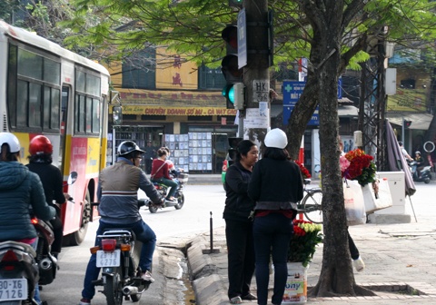 | Ngã tư là địa bàn kinh doanh của nhiều người dân. Trong ảnh là những người bán hoa ở ngã tư Bà Triệu - Nguyễn Du. |