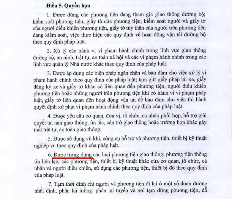 Tuy nhiên, đối chiếu với quy định của Hiến pháp, Bộ luật dân sự và đặc biệt là Luật trưng mua, trưng dụng được Quốc hội ban hành năm 2008 thì quy việc cho CSGT có thẩm quyền trưng dụng tài sản của cơ quan, tổ chức, cá nhân như trên là luật.