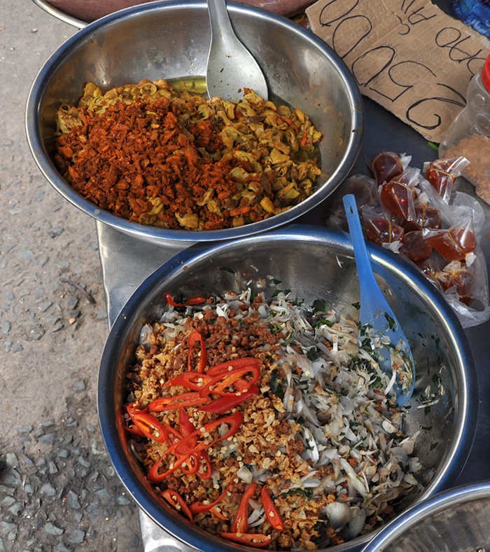 Các món ăn đặc trưng của xứ Quảng được chế biến sẵn như lòng xào nghệ, hến xào…. phục vụ người miền Trung sinh sống ở TP.HCM cũng được bán khá nhiều.