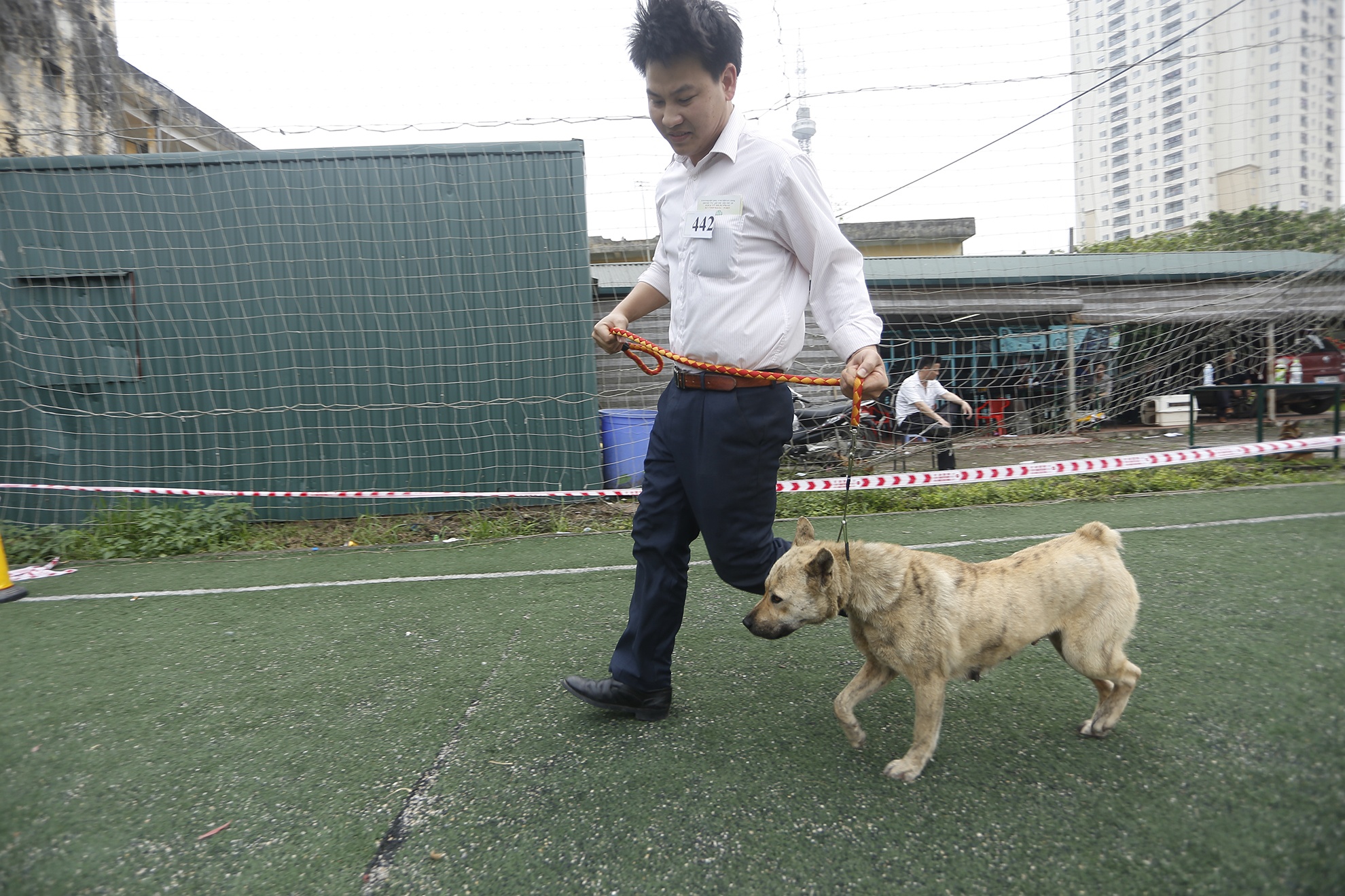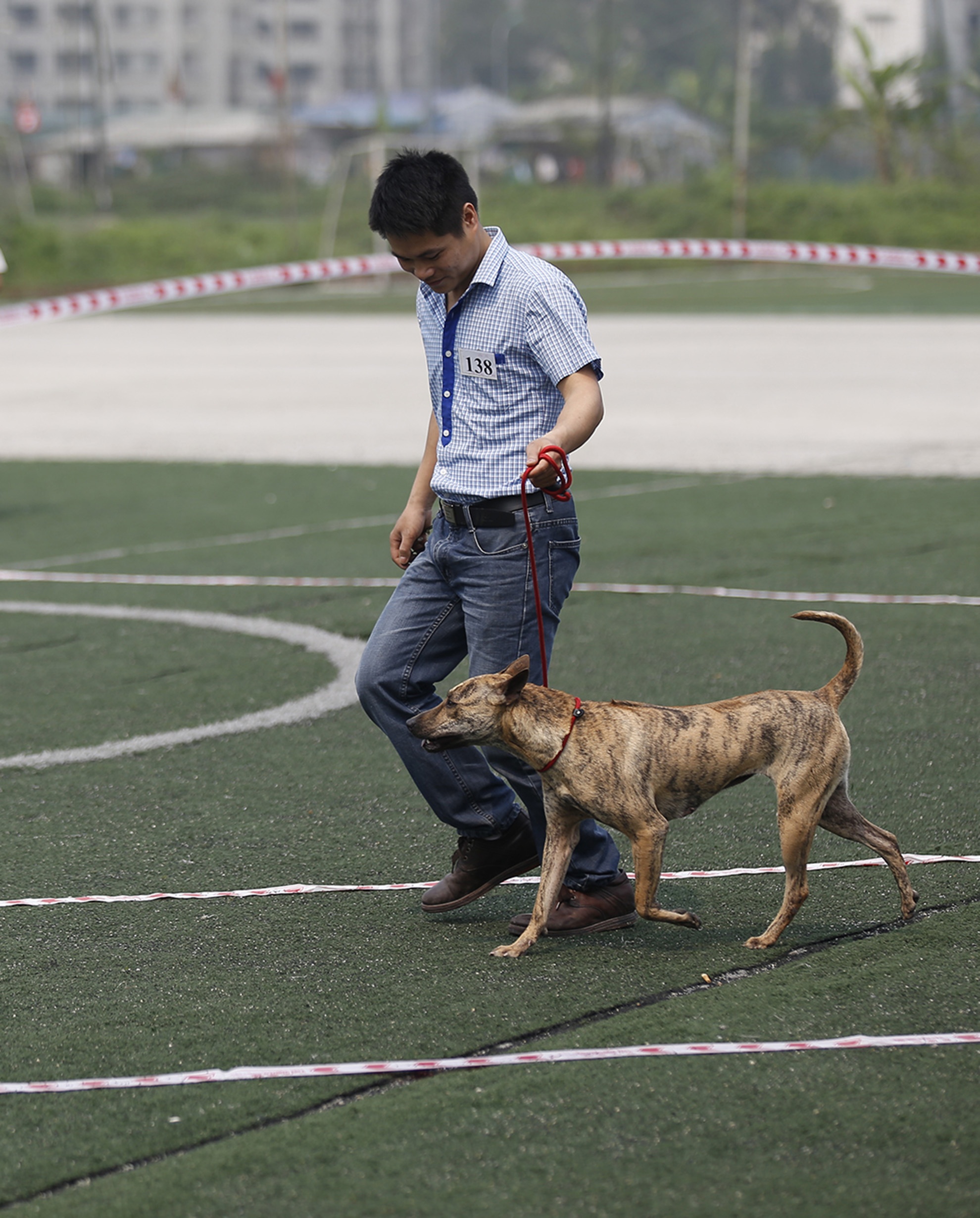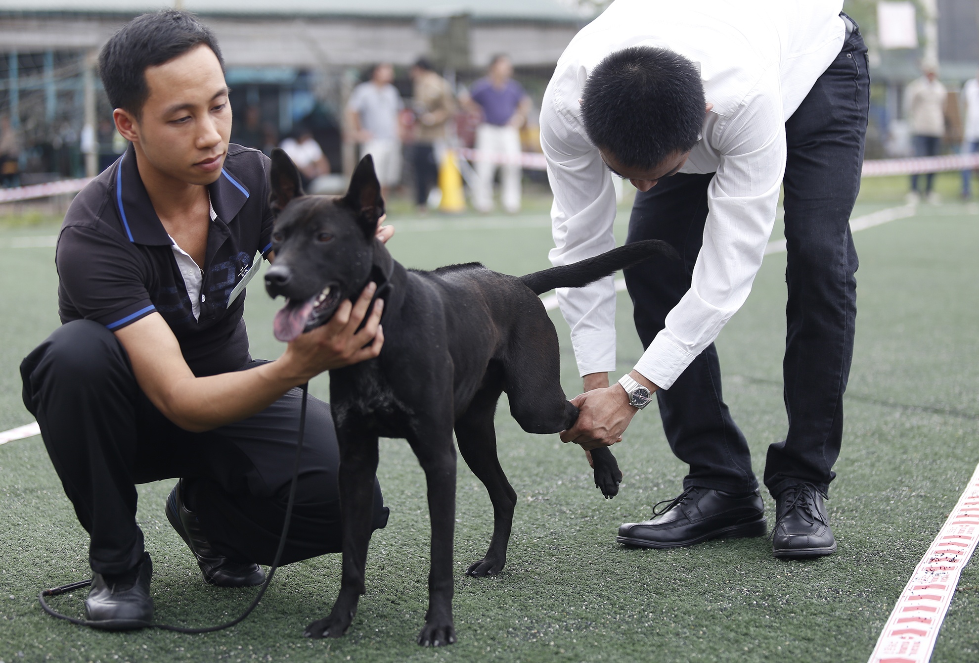 | Anh Tuấn dắt chú chó Sam (14 tháng tuổi) đi thi, anh cho biết: "Sam được ban giám khảo đánh giá là giống chó tốt với nhiều điểm tuyệt đối về thân thể, lông, chân, răng...". |