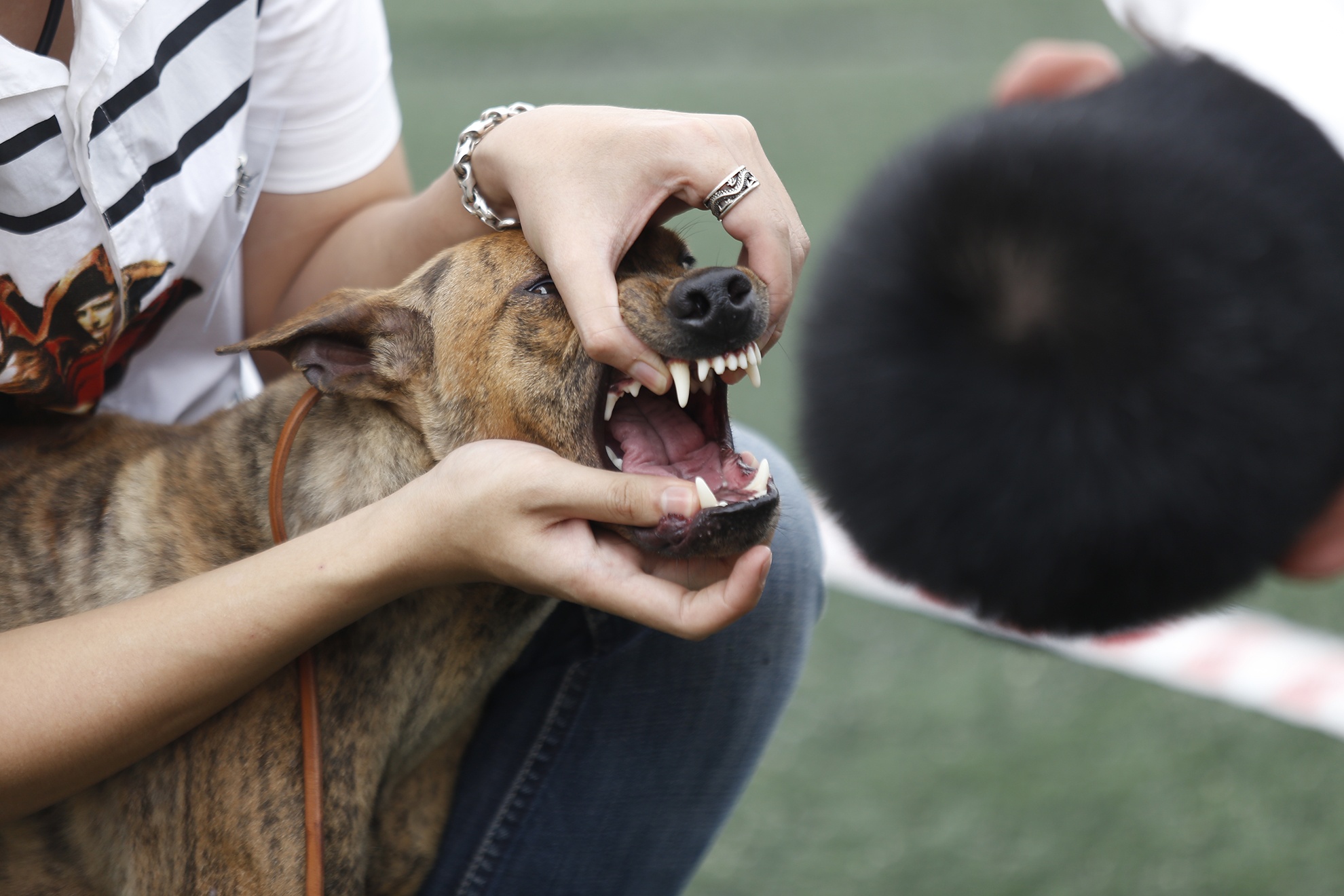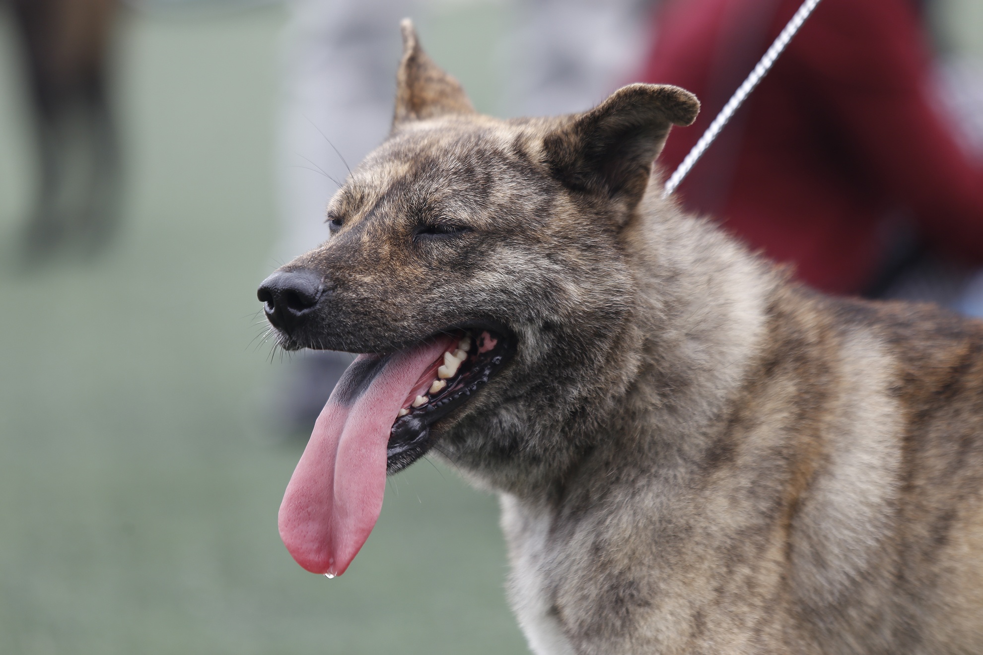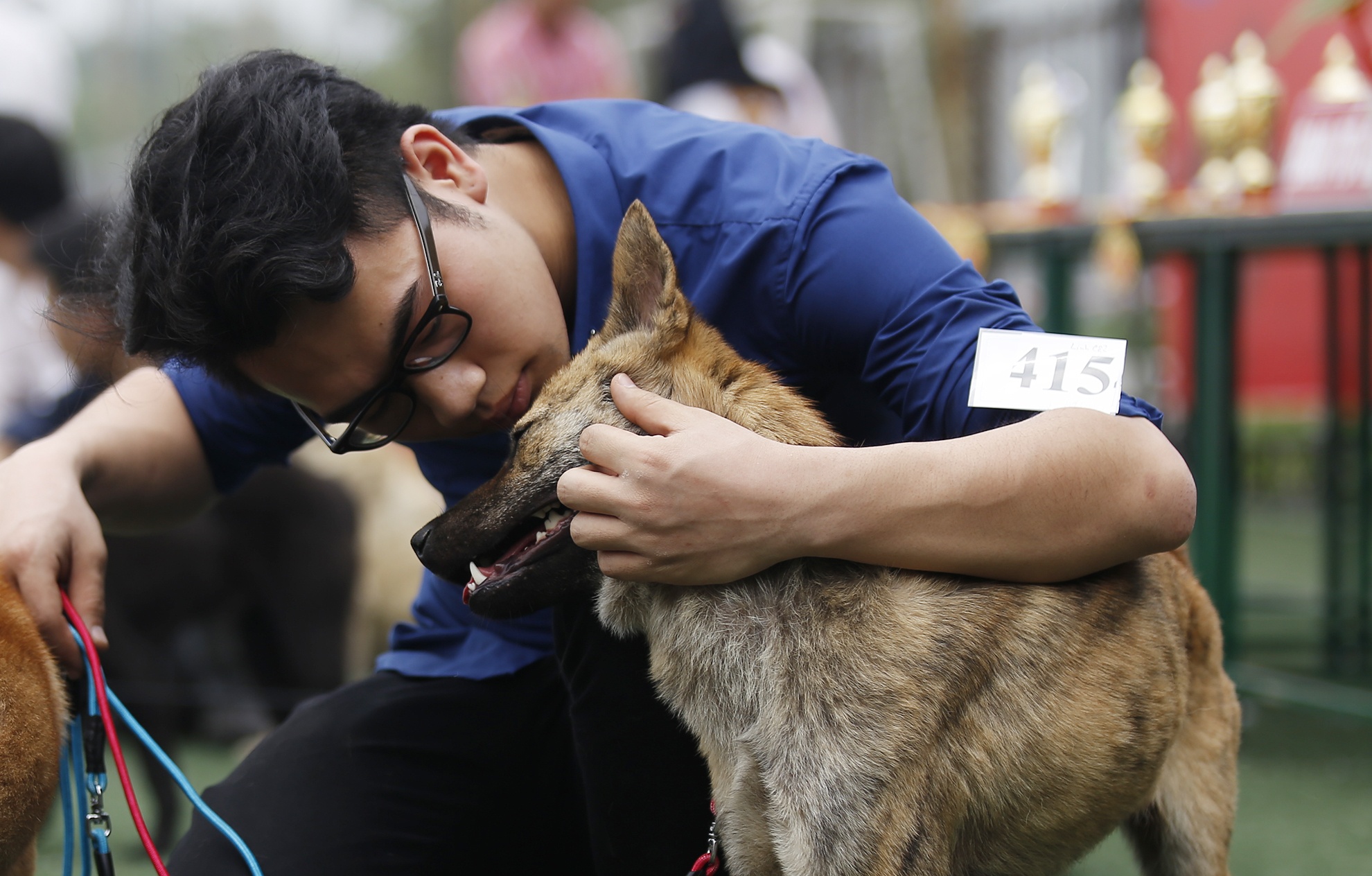 | Anh Tuấn dắt chú chó Sam (14 tháng tuổi) đi thi, anh cho biết: "Sam được ban giám khảo đánh giá là giống chó tốt với nhiều điểm tuyệt đối về thân thể, lông, chân, răng...". |