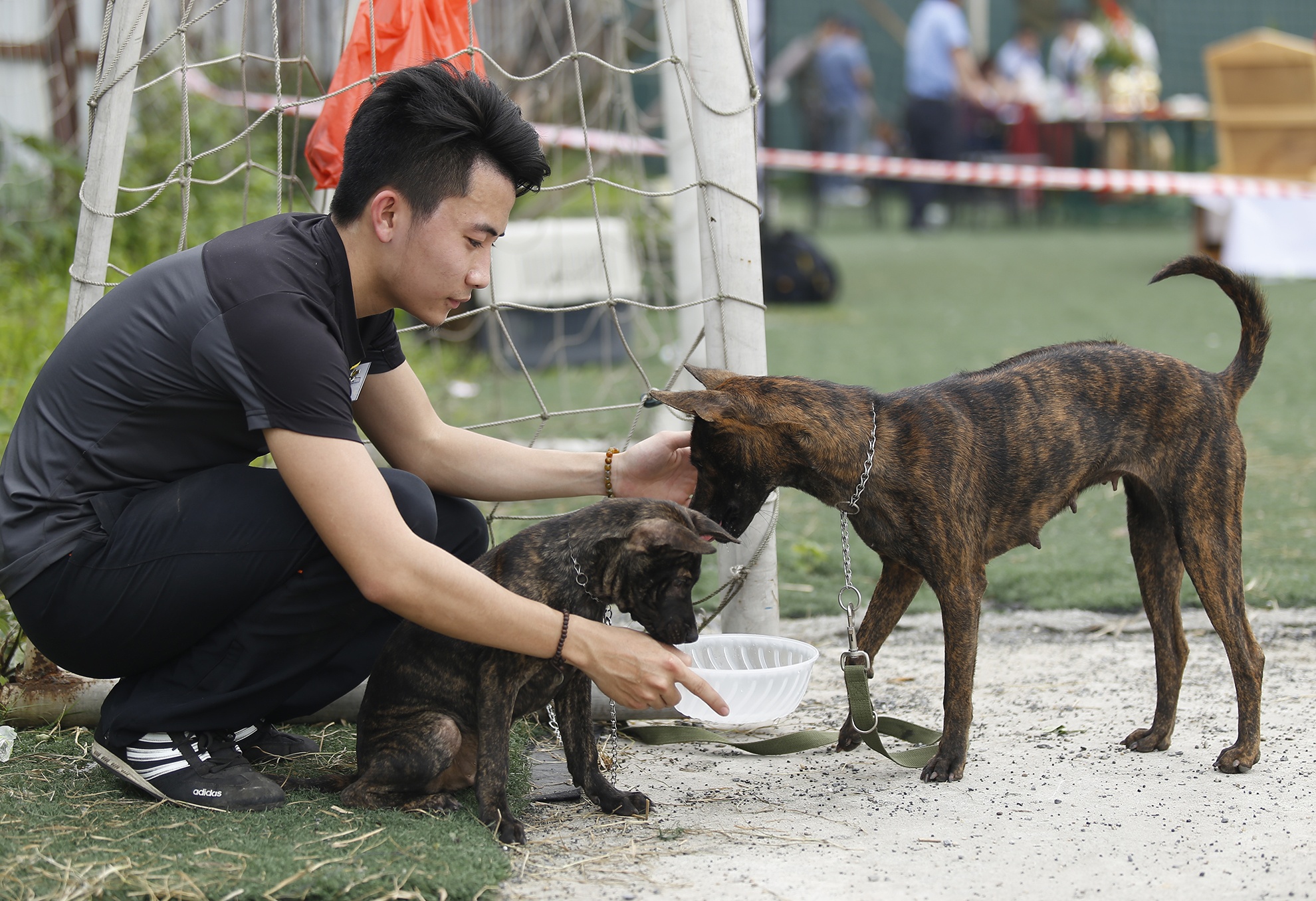 | Anh Đại chăm sóc 2 chú chó Phú Quốc ở ngoài sân để chuẩn bị thi đấu. |