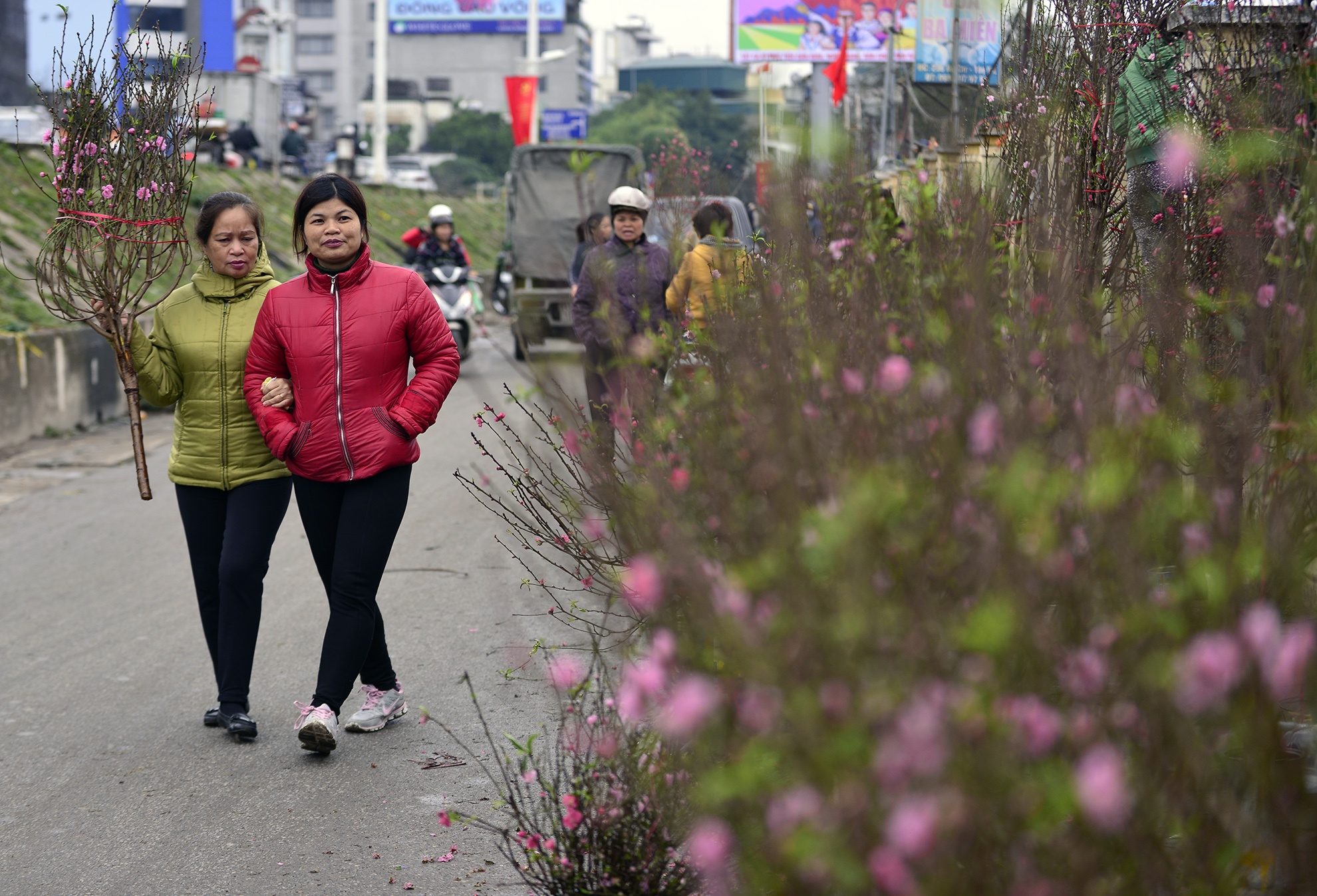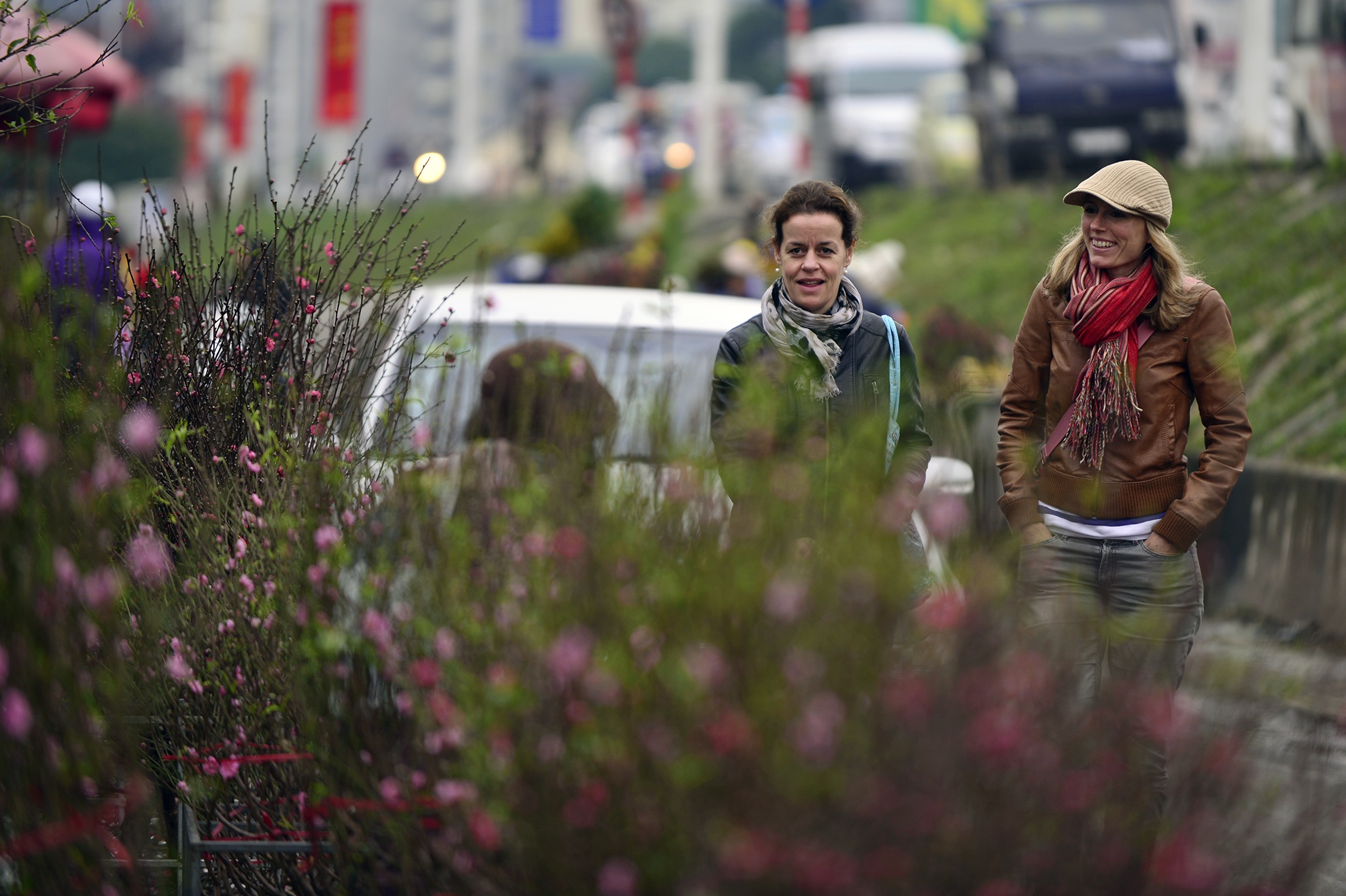 Hai vị khách quốc tế thích thú khi ngắm những cành đào tại khu chợ. Các chị cho biết, đây là lần đầu tiên đến Việt Nam vào dịp giáp Tết, được cảm nhận cái lạnh đặc trưng của Hà Nội.