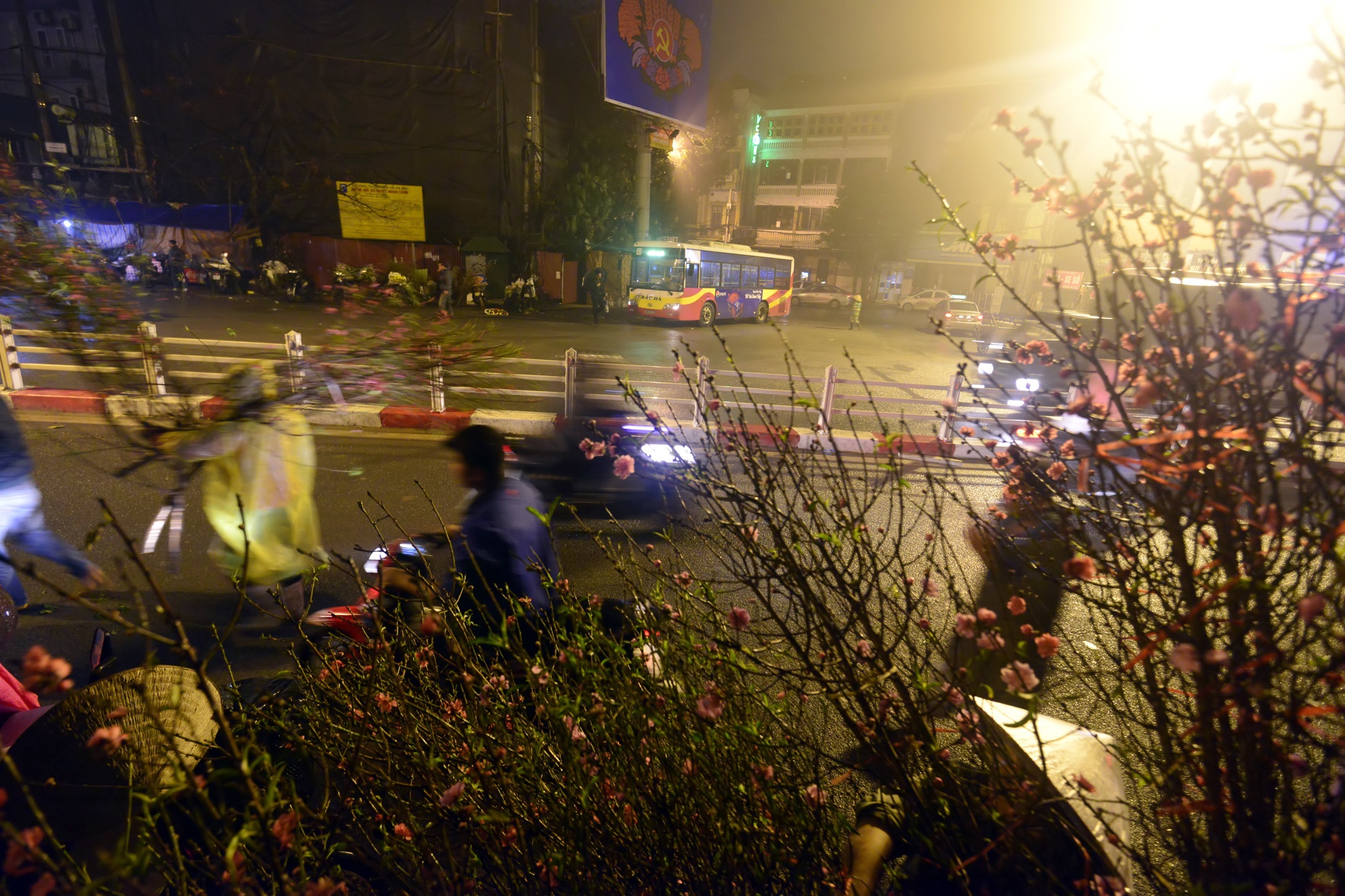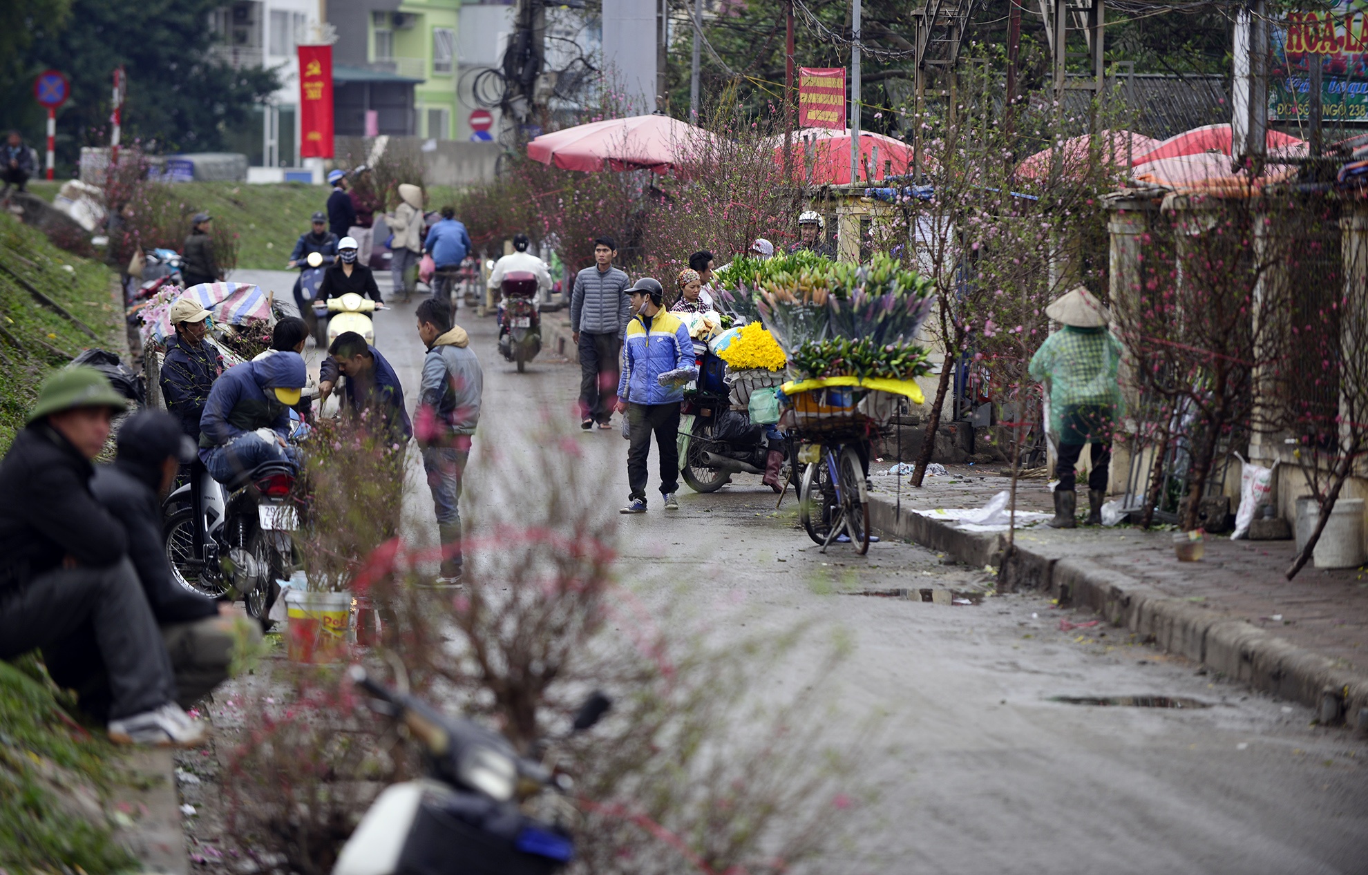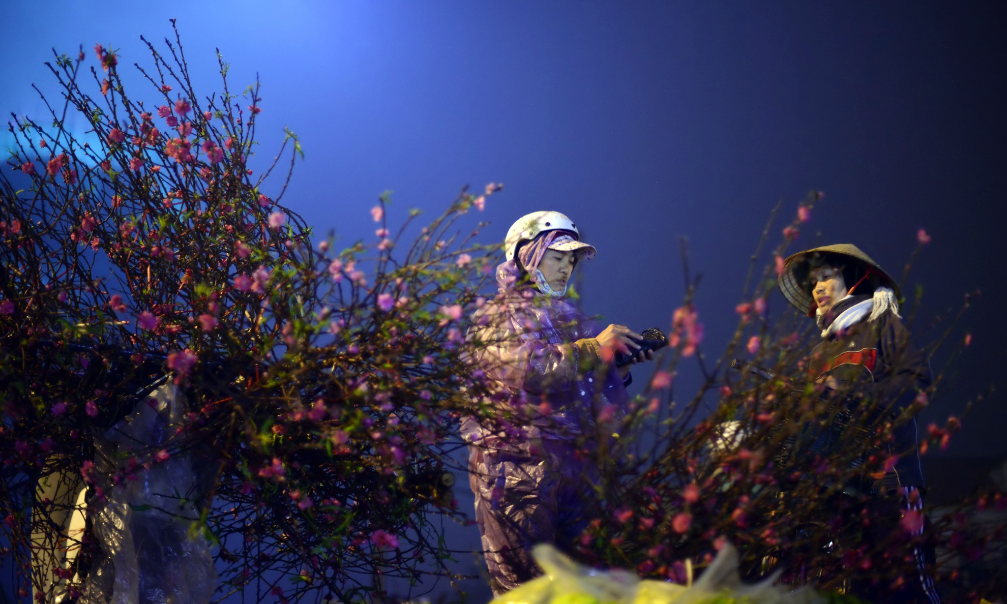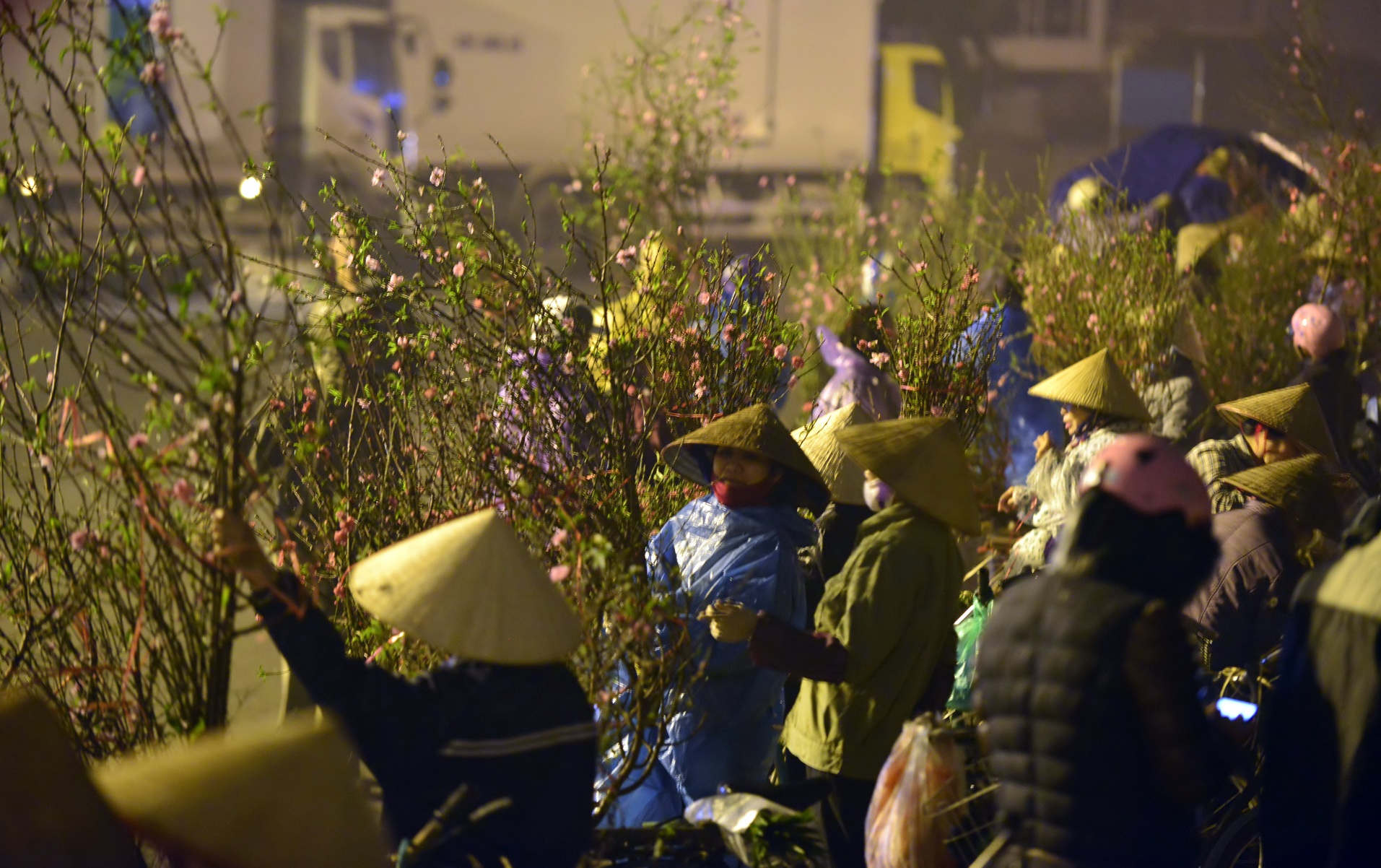 Từ 2h, khu bán đào phục vụ Tết Nguyên đán tại chợ hoa Quảng An (Tây Hồ, Hà Nội) rất tấp nập. Người bán chủ yếu là nông dân trồng đào tại làng hoa Nhật Tân. Người mua là các tiểu thương, sau đó đào được mang bán tại các chợ đầu mối, chợ cóc.
