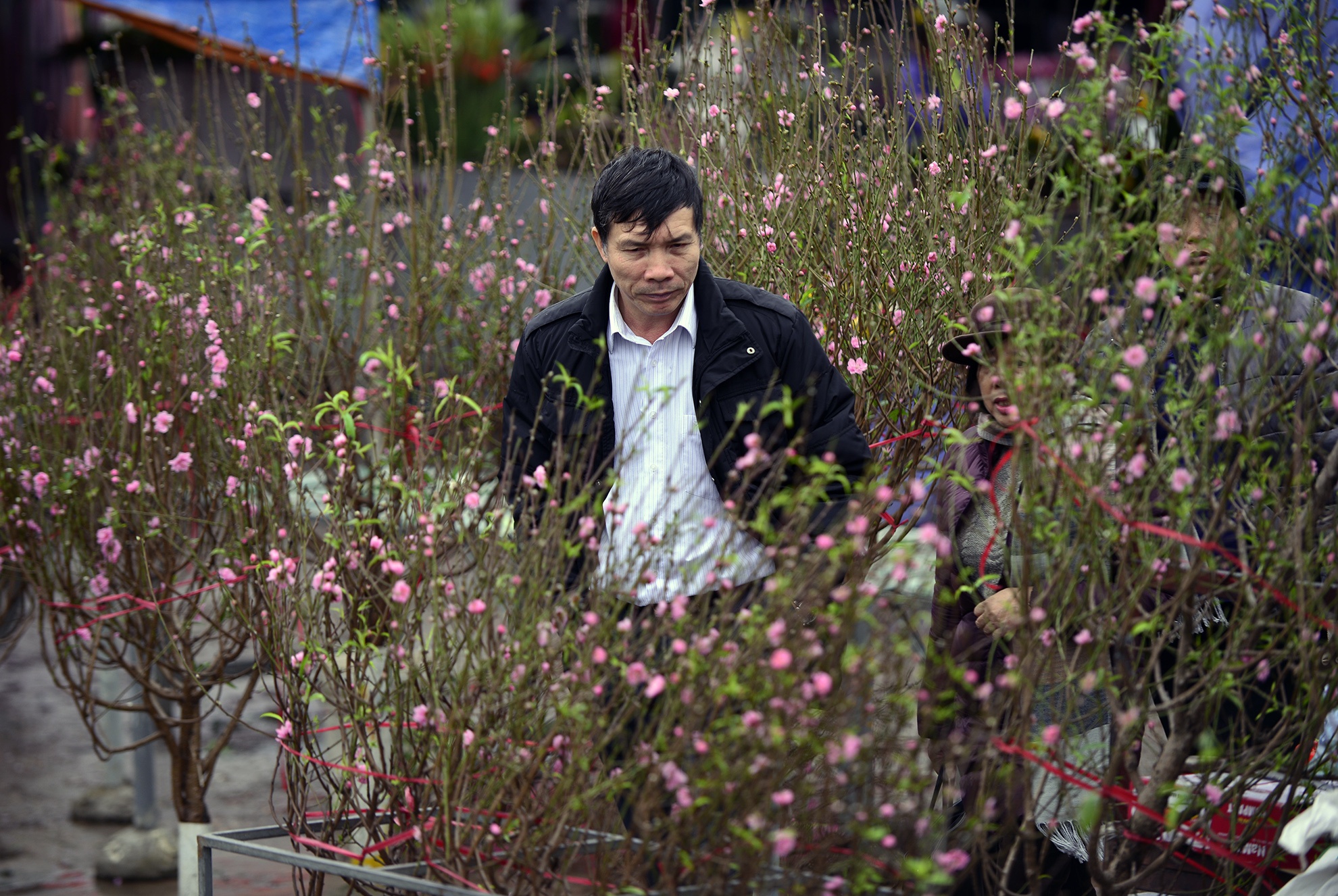 Còn hai tuần nữa mới đến Tết Nguyên đán nhưng tại các khu chợ hoa Quảng An, vườn đào Nhật Tân (Hà Nội), cảnh mua bán sôi động đã sớm diễn ra.