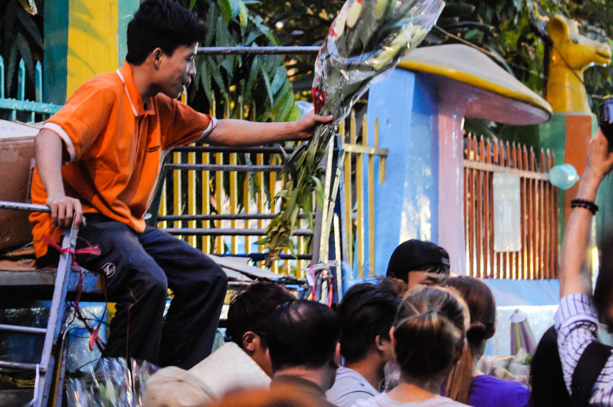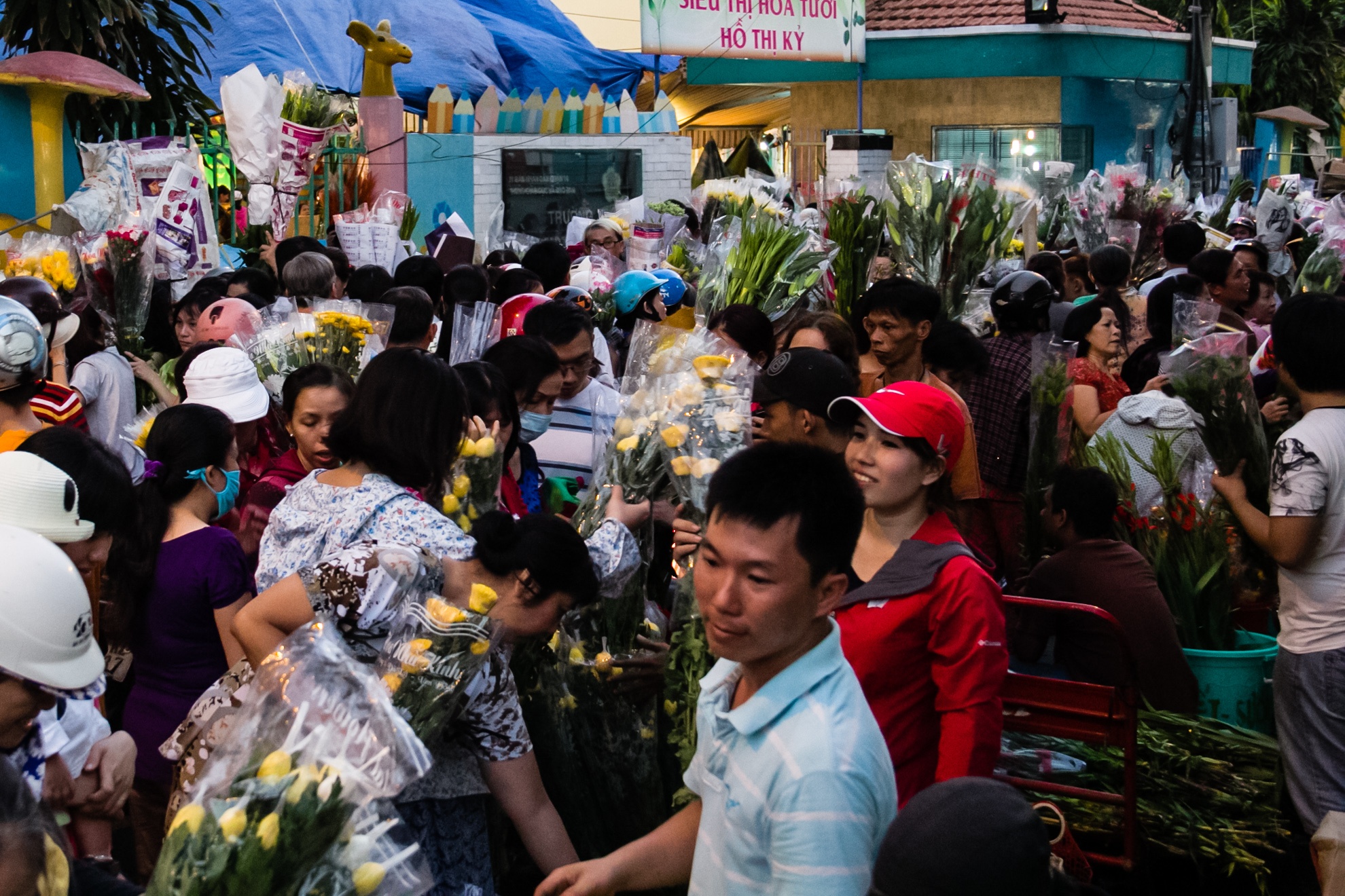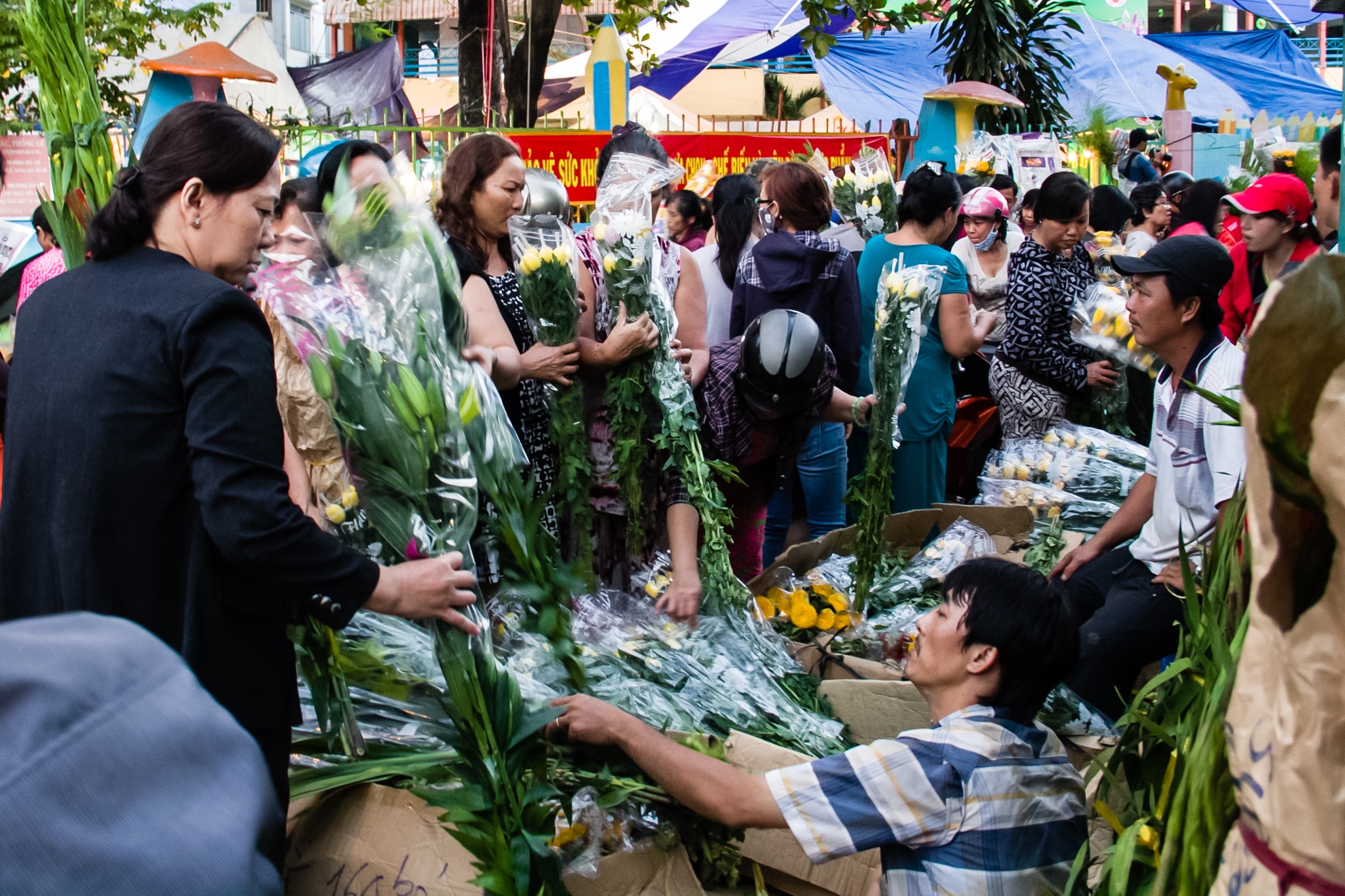 | Càng về cuối ngày, dòng người đổ xô đi mua hoa càng đông khiến đoạn đường vào chợ bị kẹt cứng, những người bán hoa phải leo lên cao để bán hàng. |