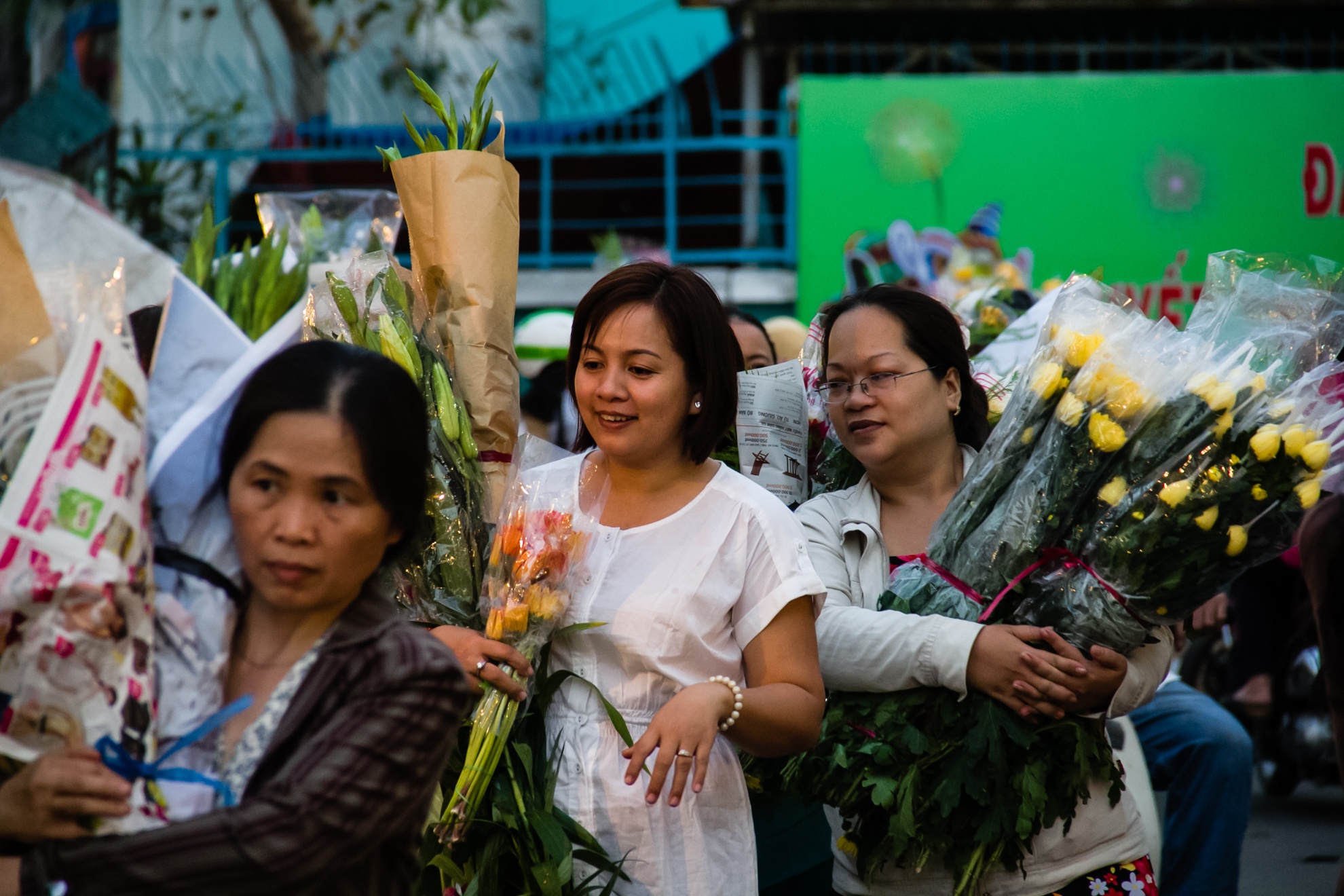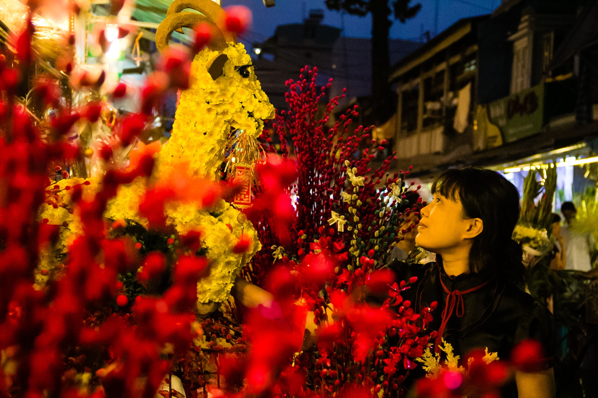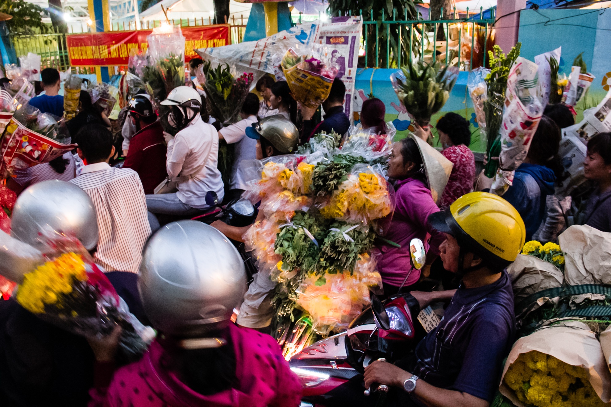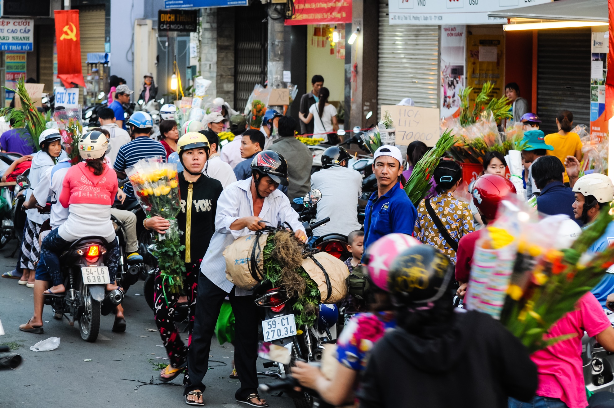 Đến tối, việc mua bán vẫn tập nập, tình trạng giao thông trở nên lộn xộn khi người bán ngang nhiên mang hoa ra bán giữa lòng đường.