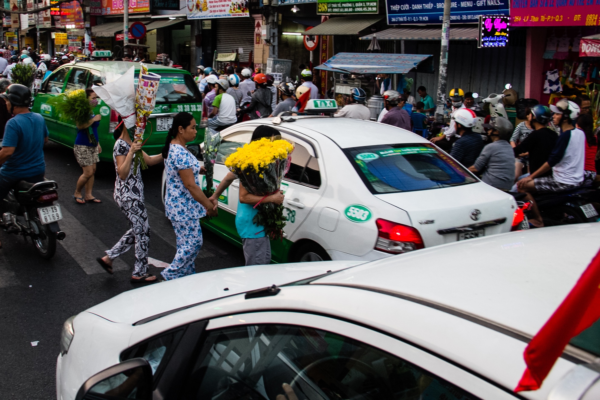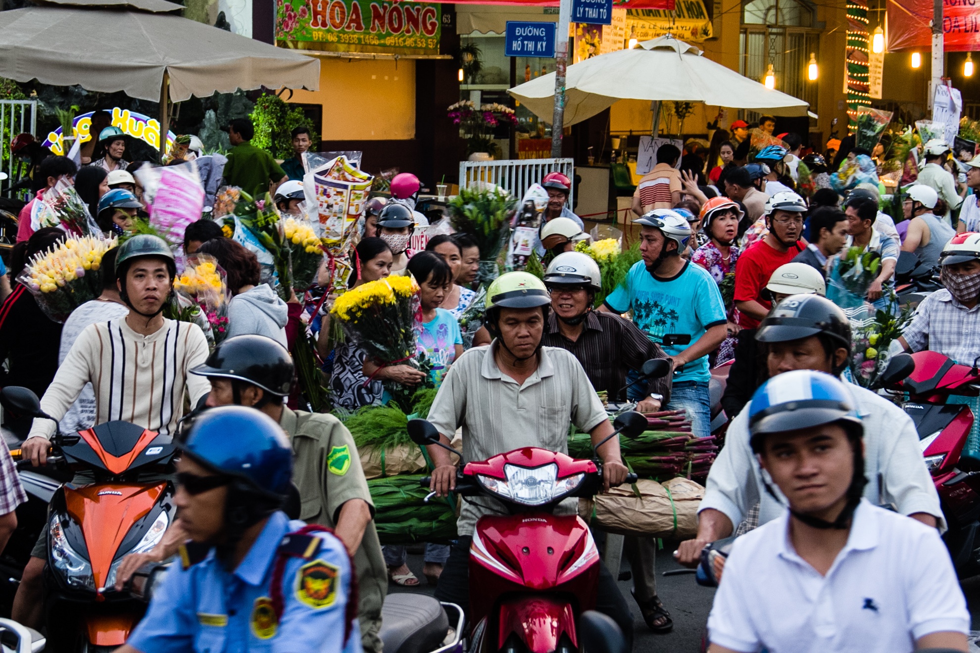 Chiều 29 Tết, hàng nghìn người dân TP HCM cùng đổ xô đến chợ hoa Hồ Thị Kỷ (quận 10) để mua hoa về chưng Tết, khiến giao thông xung quanh khu vực này hỗn loạn.
