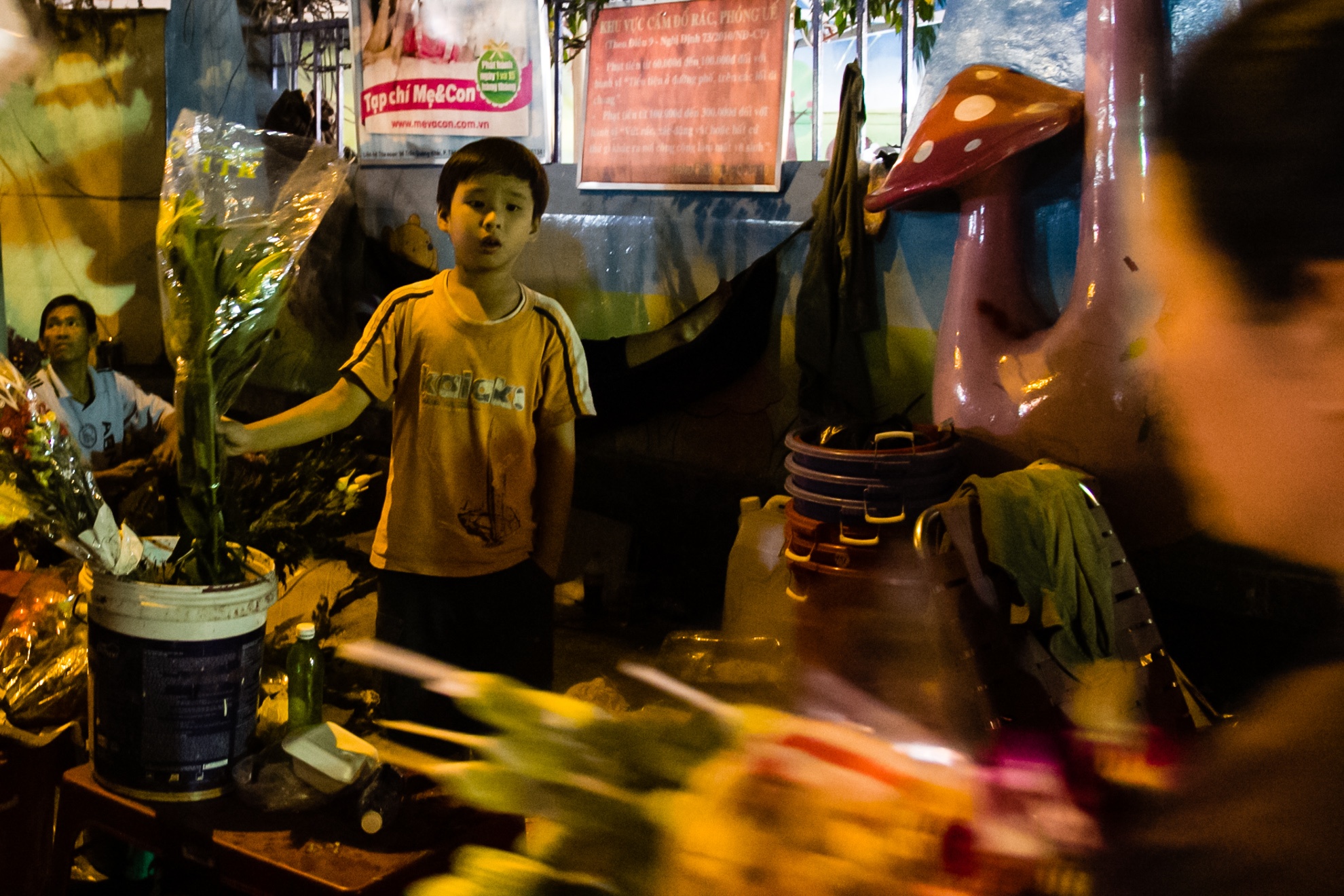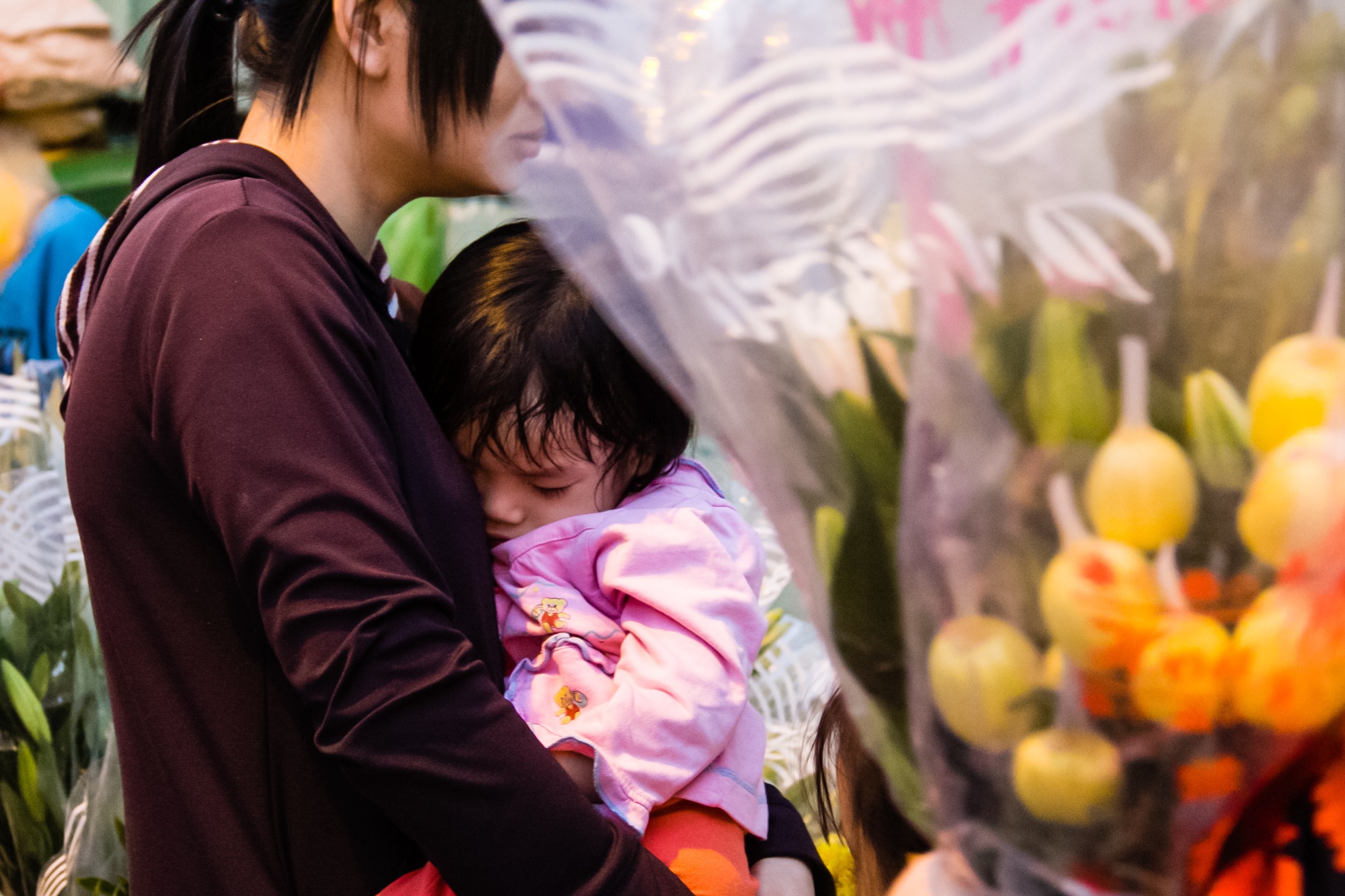 | Một em nhỏ đi theo mẹ ra chợ hoa và ngủ thiếp đi. |