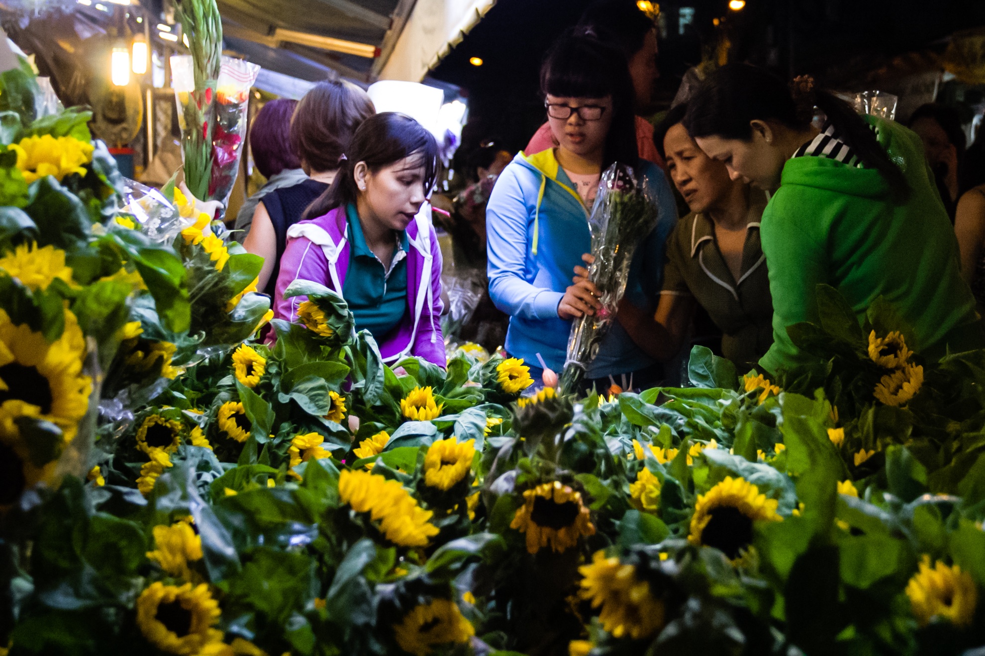 | Dù đông đúc, nhưng người mua vẫn cẩn thận lựa chọn từng bông hoa ưng ý. Hoa hướng dương cũng là mặt hàng được yêu thích, với giá bán 1 bó 50.000 đồng. |