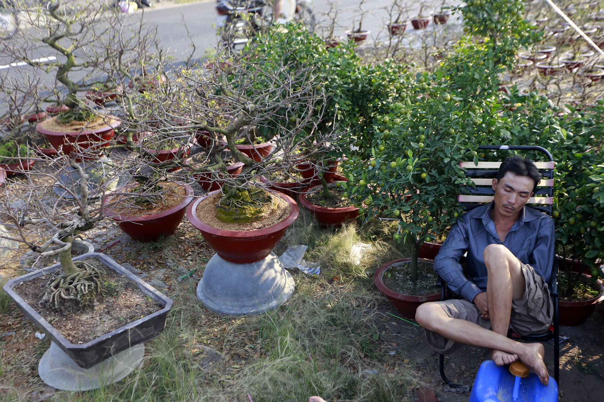 Anh Thành (Sa Đéc, Đồng Tháp) tranh thủ nghỉ trưa bên khu vực trưng bày hoa mai, quất của mình.