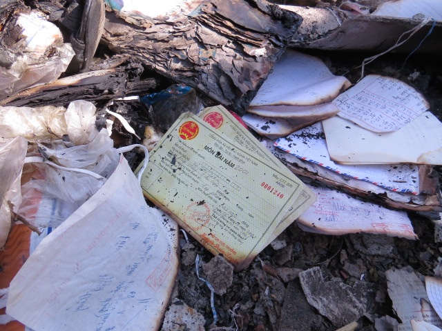 | Biên lai hàng hóa cùng sổ ghi công nợ, thu chi bị cháy nham nhở. |
