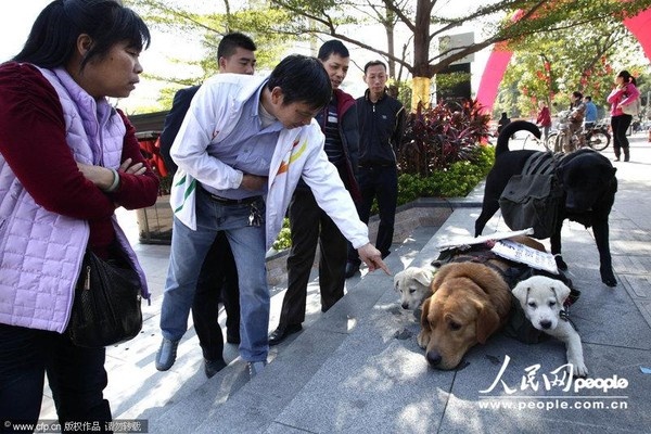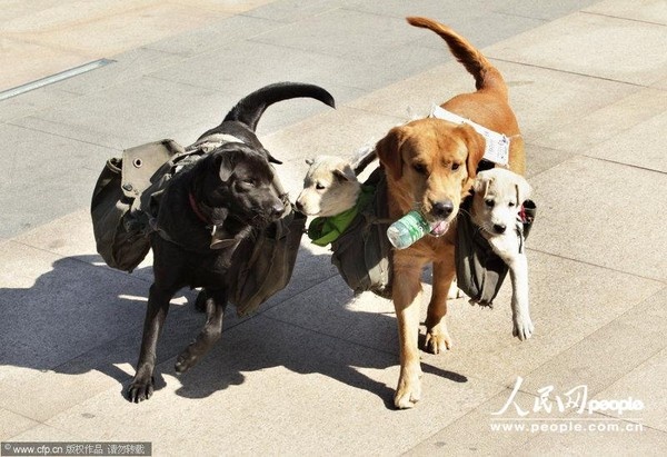 Ngày 29/11, một cô chó mẹ lông vàng địu hai chú chó con lông trắng hai bên, trên lưng gắn tấm bảng ghi chữ “bán với giá 1.500 tệ" (hơn 5,2 triệu đồng), theo sau còn có một chú chó mực trông giống như vệ sĩ xuất hiện trên đường phố Quảng Châu, Trung Quốc đã khiến nhiều người qua đường chú ý.