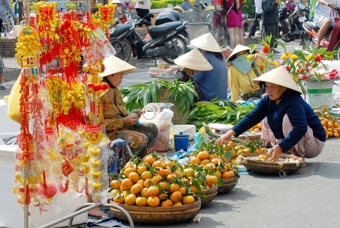 Trong đó, được bày bán nhiều nhất vẫn là các hàng quần áo may sẵn, giày dép, bánh mứt, thực phẩm phục vụ nhu cầu trong ba ngày Tết. Chợ Tết khác với chợ thường ngày là có thêm hàng hoa và các loại hoa quả làm mâm ngũ quả.