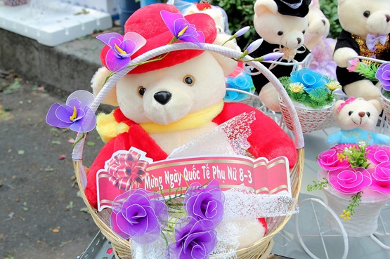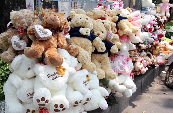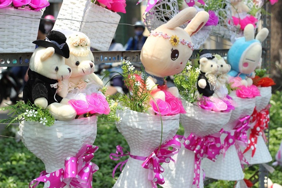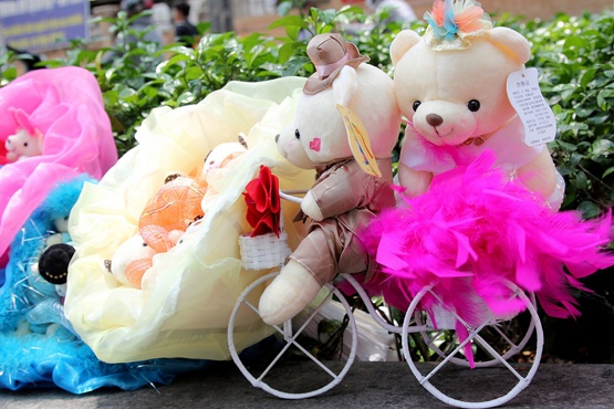 | Những chú gấu bông được kết thành bó hoa đang là loại hàng lưu niệm hút khách. |