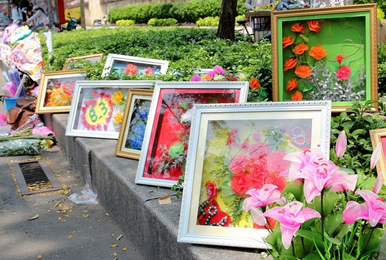 | Một khung tranh như thế này có giá bán 500.000 đồng, người bán cho biết để làm ra một khung tranh hoa như thế này phải mất ít nhất một ngày công. |