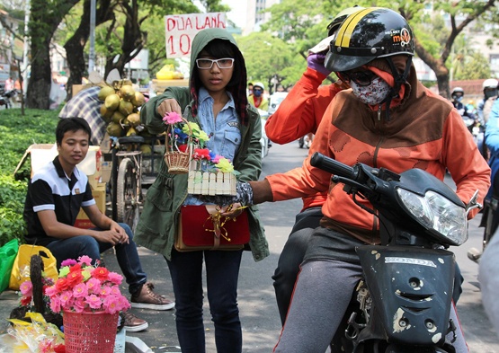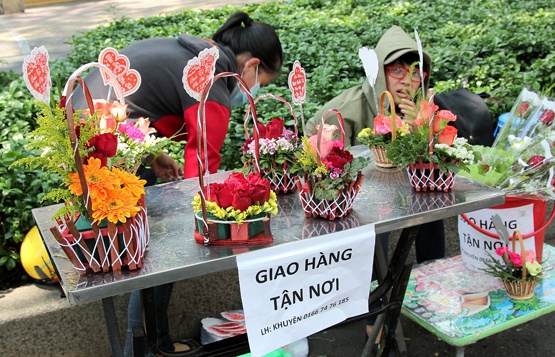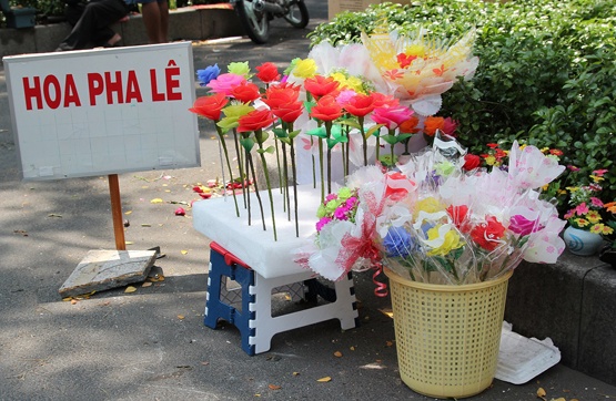 | Trên đường Nguyễn Văn Cừ, quận 5, hàng loạt "gian hàng" do các nhóm sinh viên lập nên để bán hoa và đồ lưu niệm phục vụ cho ngày 8/3. |