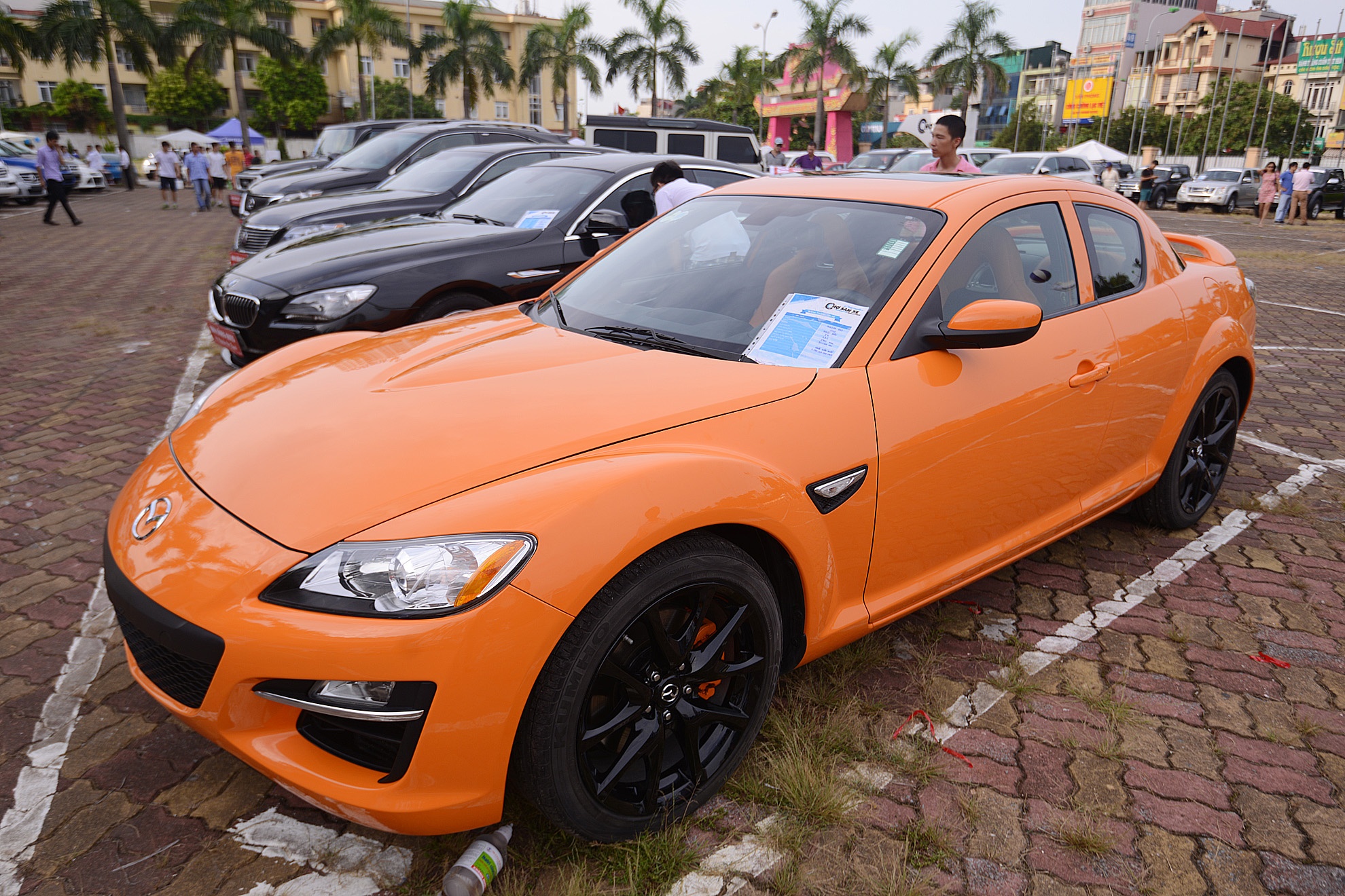 | Mặc dù không có nhiều đợt dân buôn bán xe mở chợ bán như thế này nhưng không khí khá vắng vẻ. Trong ảnh là chiếc Mazda RX 8 sản xuất năm 2008 xếp hàng chờ khách với giá 1,18 tỷ đồng rao bán. |