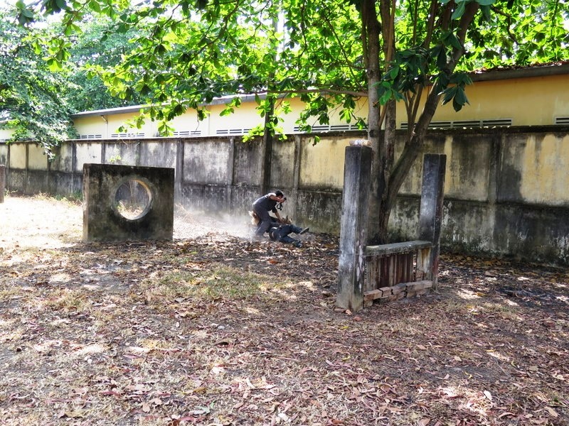 | "Thám tử" tên Bin đang thực hiện động tác chui ống cống. |