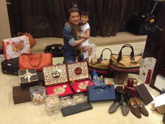 | Đàm Vĩnh Hưng bên những món quà của fan tặng. |