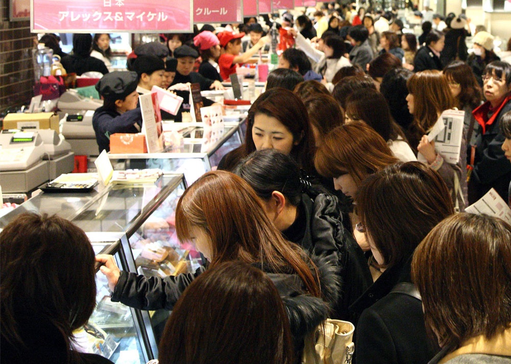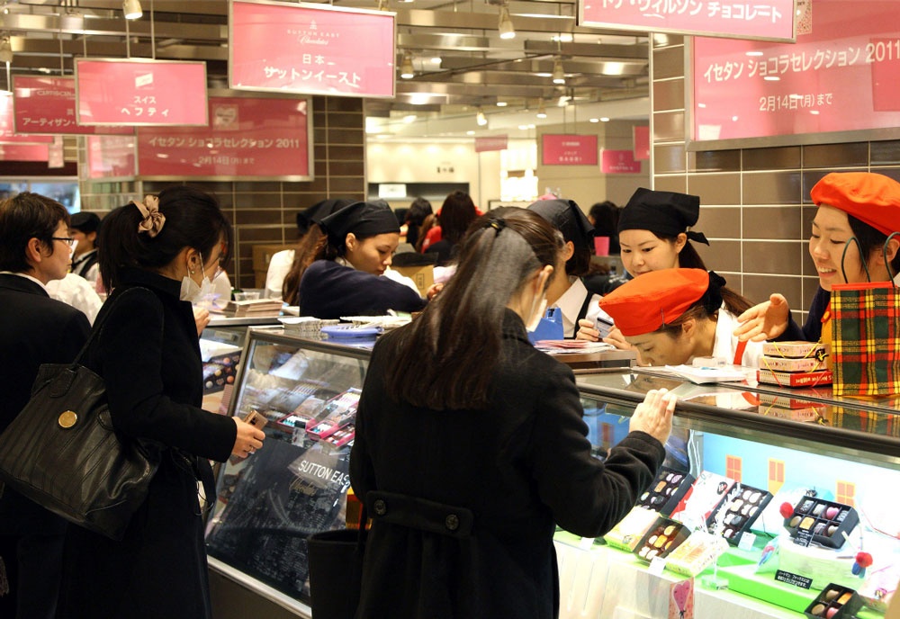 Một cửa hiệu ở Tokyo trước ngày 14/2. Theo AFP, 1/2 trong tổng doanh thu 11 tỷ USD từ việc kinh doanh chocolate của Nhật Bản trong một năm được thu về vào tháng 2. Ảnh: Japan Times