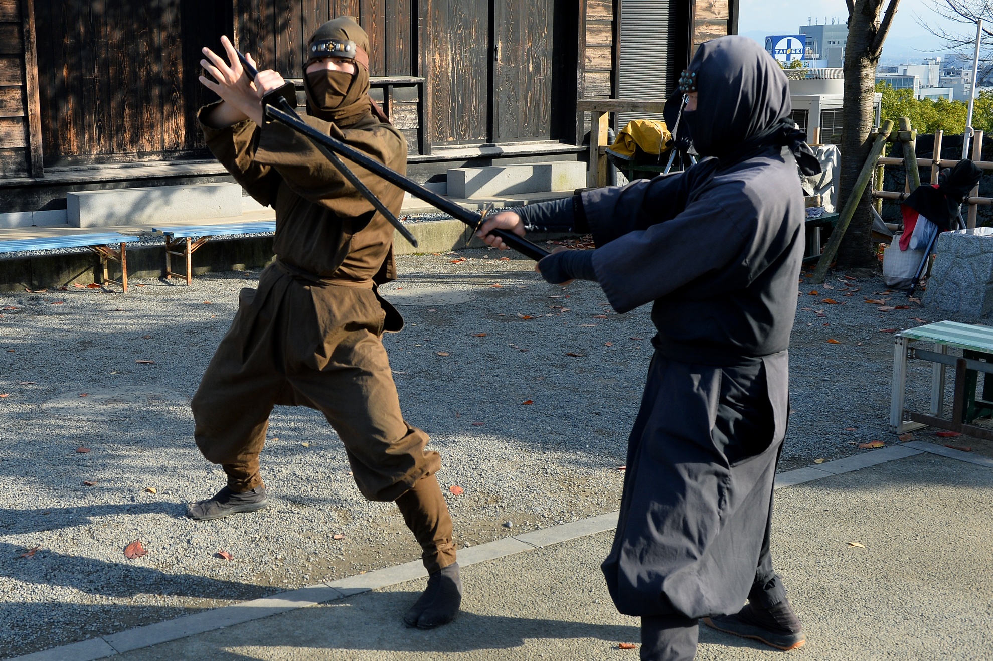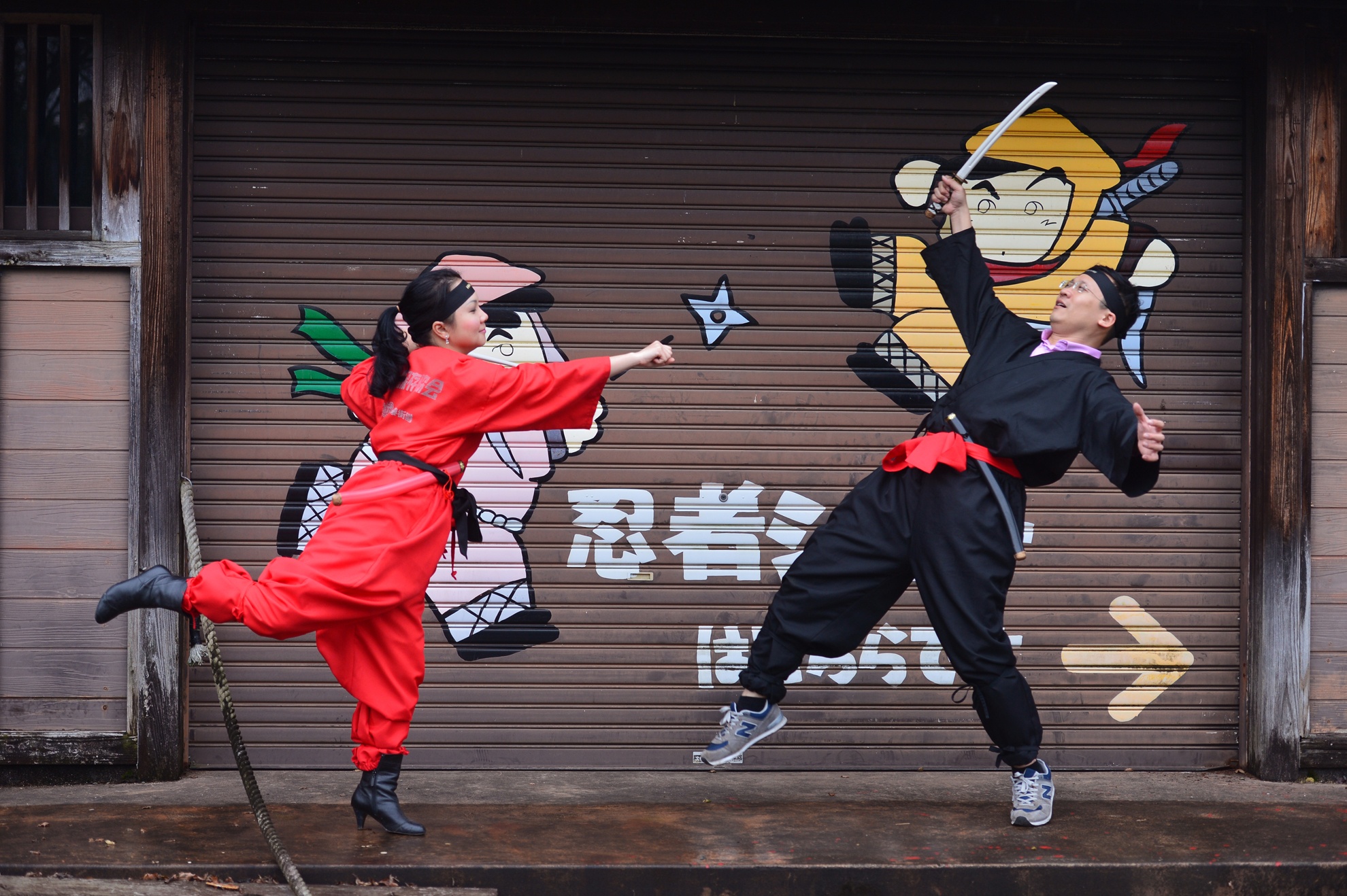 | Khi ghé thăm, du khách có thể gặp rất nhiều hình ảnh Ninja dọc đường do các nhân viên làm việc hóa trang. Đặc biệt, các anh chàng đóng vai "gián điệp, lính đánh thuê" này luôn lễ phép chào hỏi bằng cách cúi đầu, đặt hai tay vào nhau, ngón trỏ và giữa tay trái dựng thẳng. |