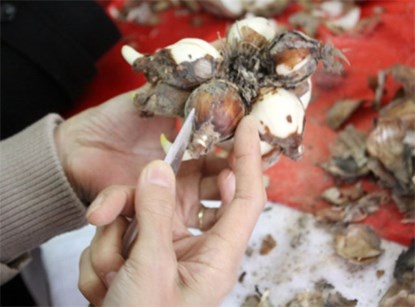Theo ông Nguyễn Hữu Ân, không phải ai cũng gọt được củ hoa thủy tiên nở đúng giao thừa. Thường thì để có hoa chơi mấy ngày Tết, ông phải chuẩn bị từ trước đó hơn 1 tháng. Trước hết phải chọn mua những củ hoa to, mập, chắc, đem về bóc hết đất ở đáy củ và các bẹ lá khô rồi ngâm nước 1-2 ngày cho vỏ hút nước căng mọng để dễ gọt.
