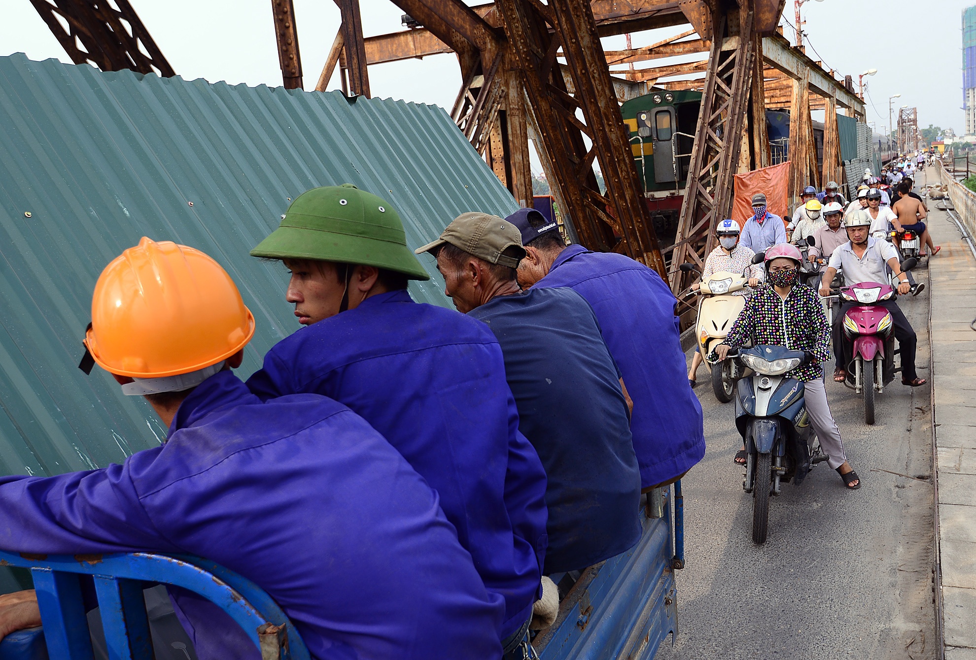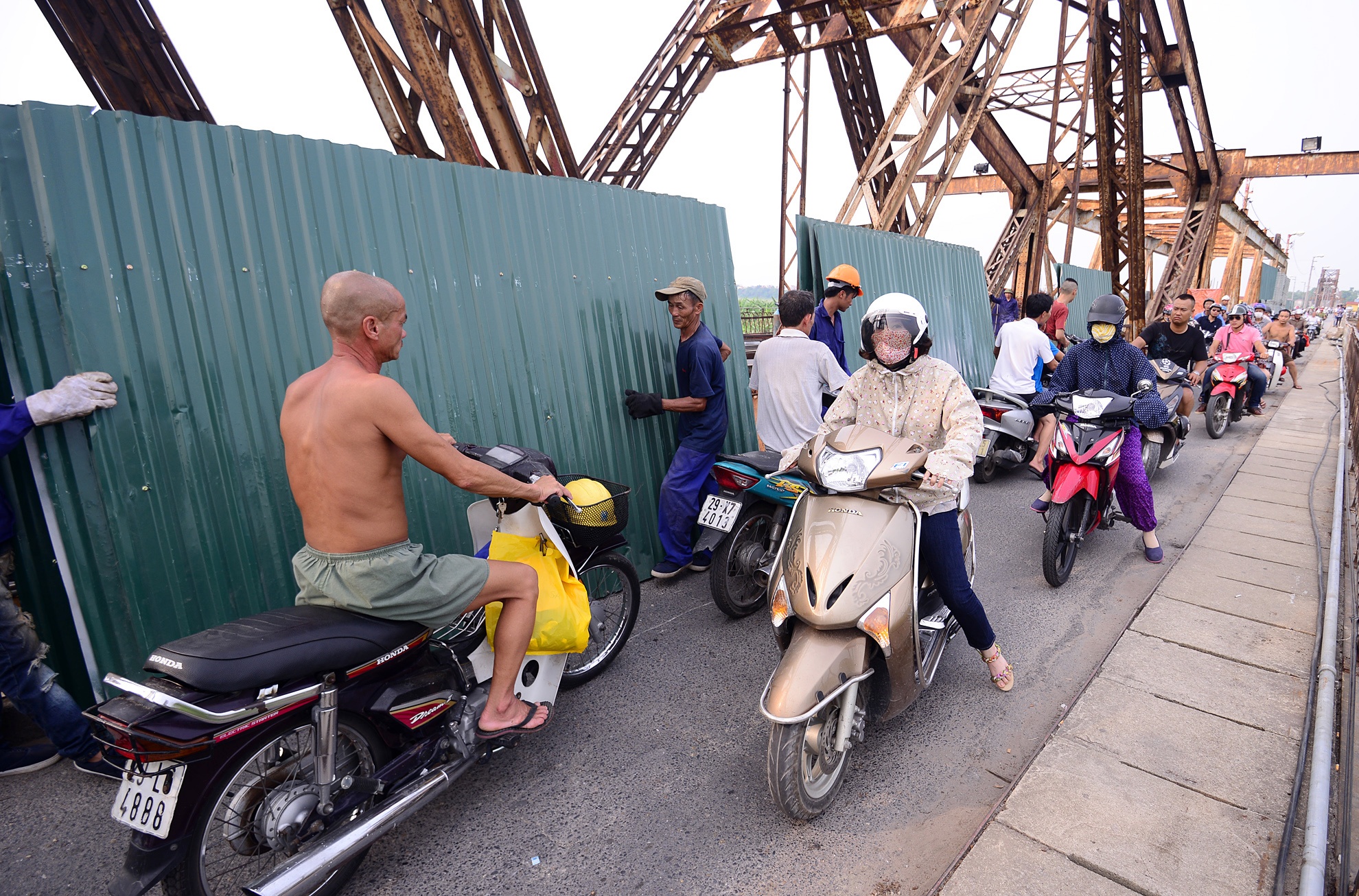 Việc trùng tu cầu Long Biên (Hà Nội) diễn ra vào ban ngày khiến cho hai lối qua sông thường xuyên bị ùn tắc giao thông, đặc biệt là vào giờ cao điểm.