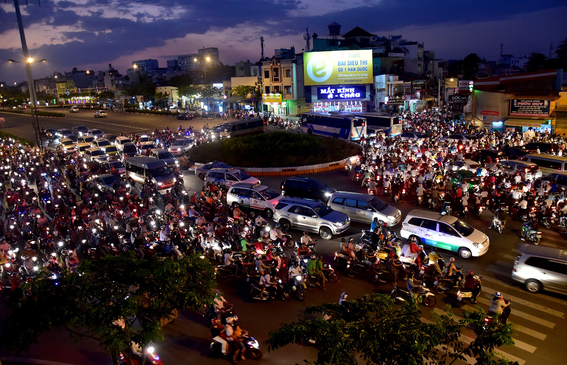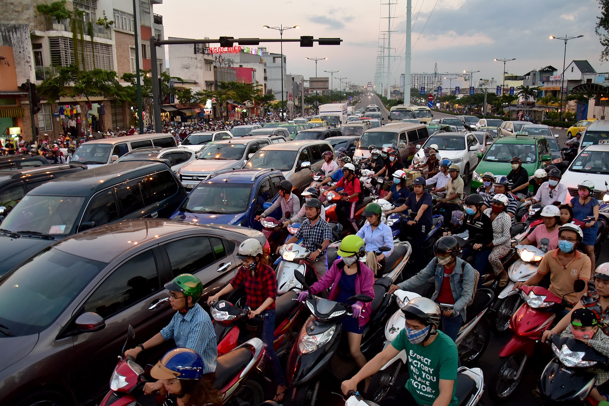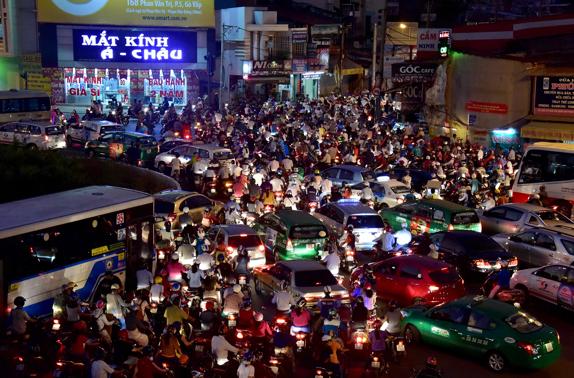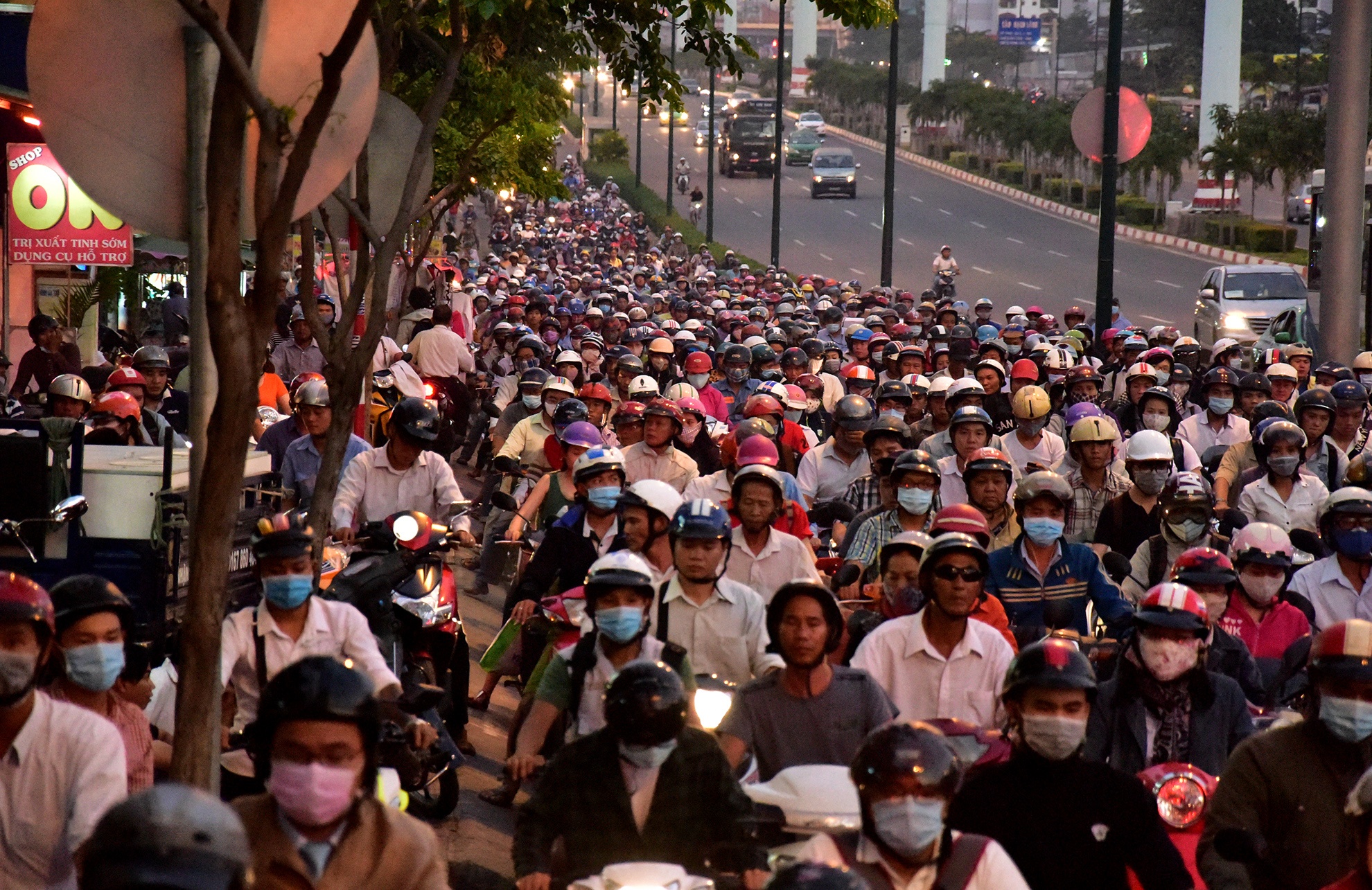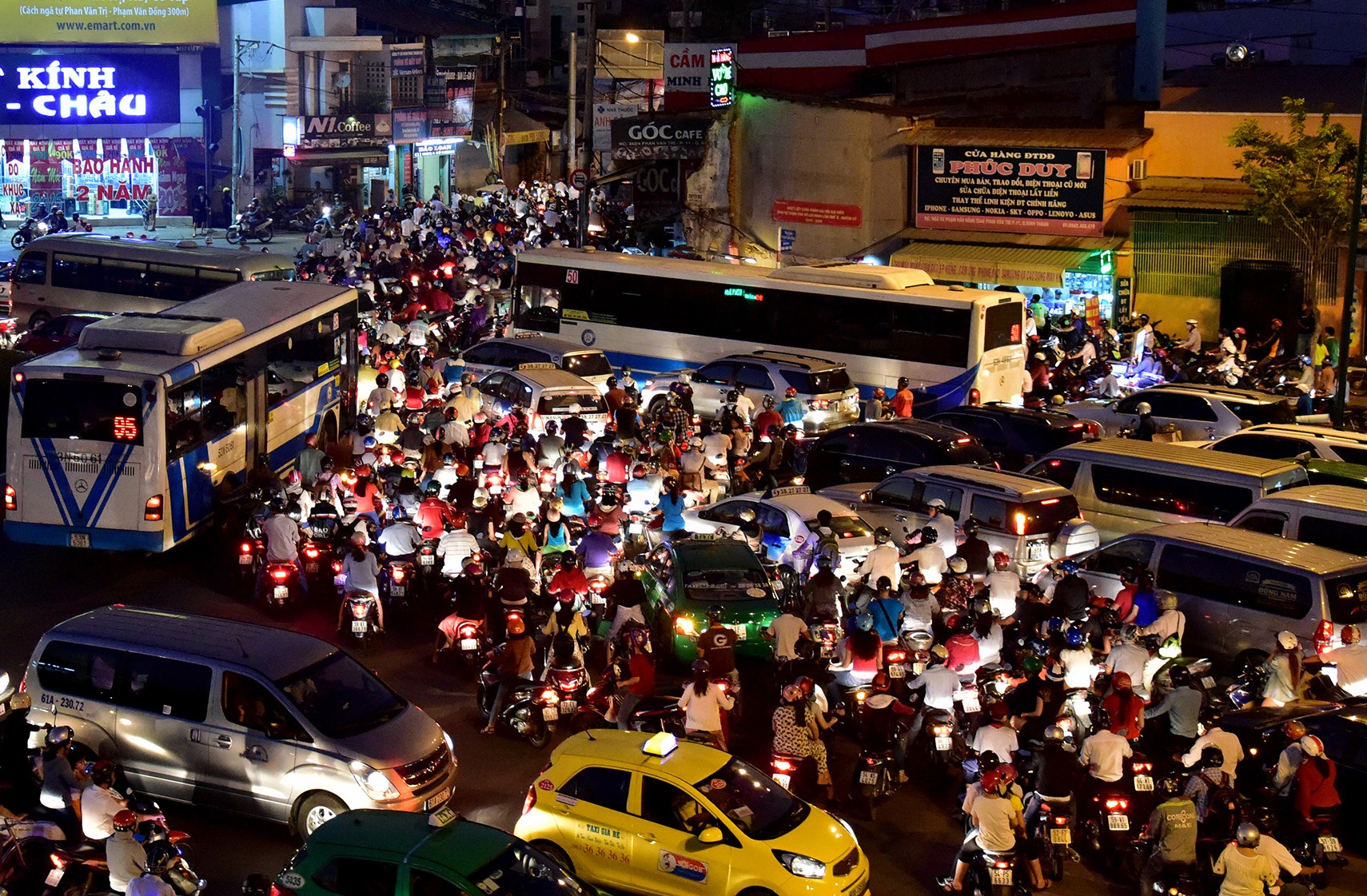 Chiều 28/12, hàng nghìn người đi xe máy bị chôn chân, khó nhúc nhích tại giao lộ thắt cổ chai Phan Văn Trị - Phạm Văn Đồng (quận Gò Vấp, TP HCM).