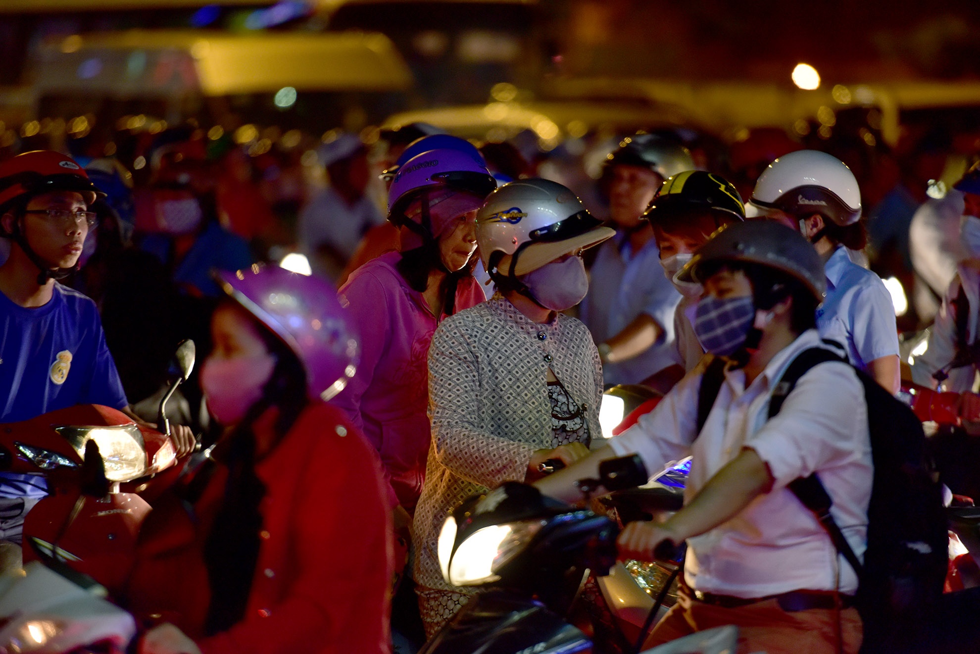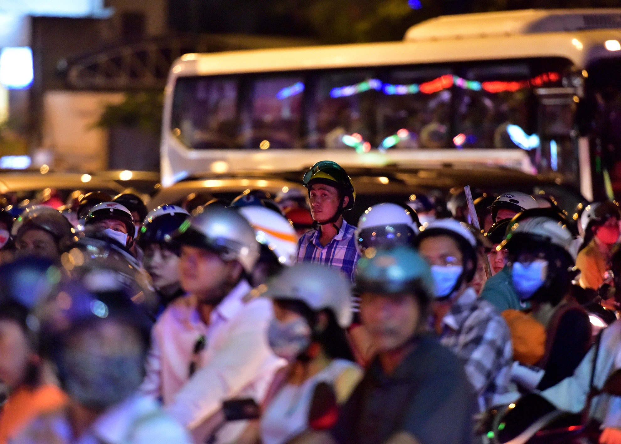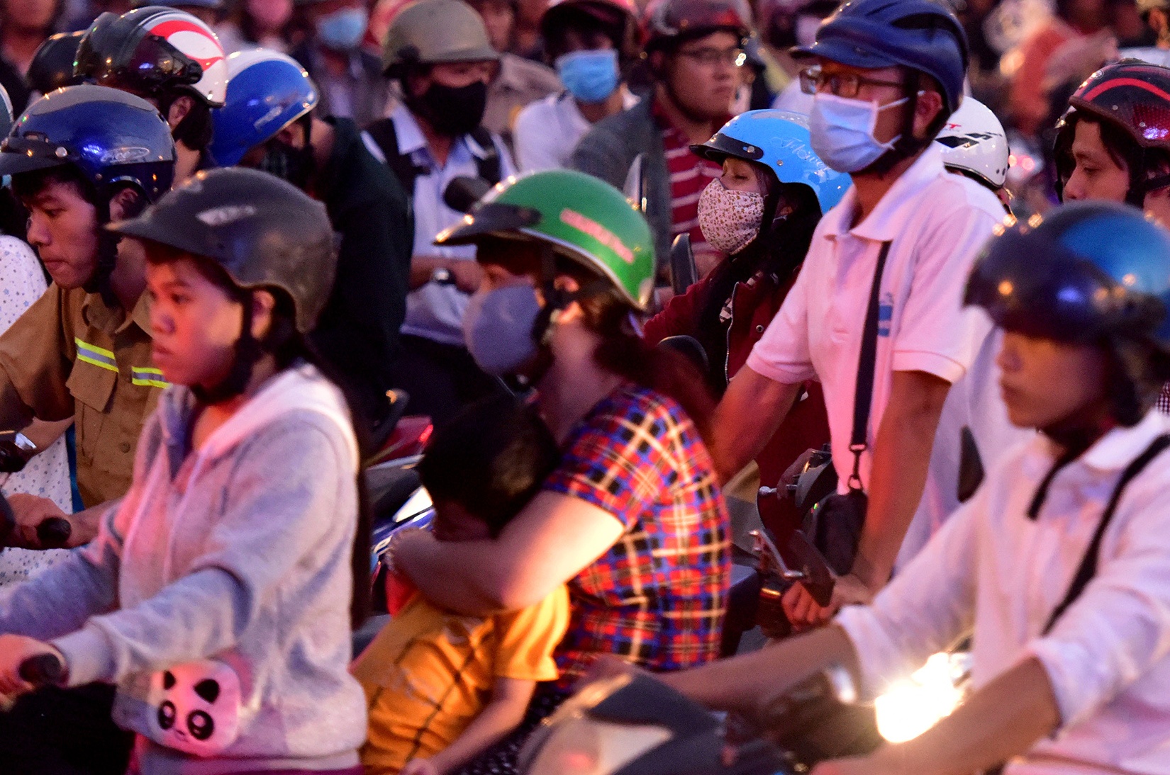 | Trẻ nhỏ ngủ gục, người lớn mệt mỏi giữa dòng xe cộ. |