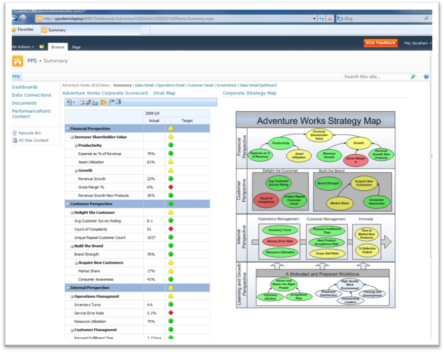 | Báo cáo dạng Scorecard được tạo bằng PerformacePoint Services. |