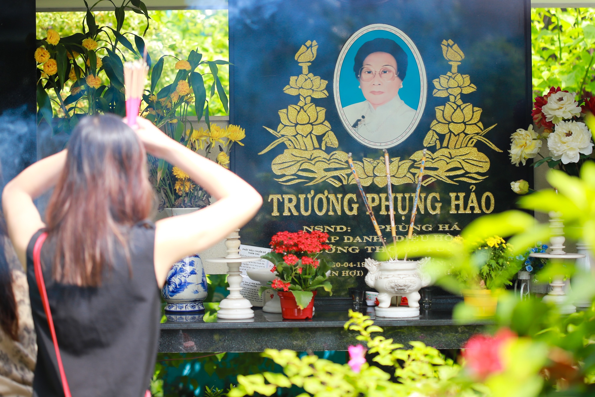 | Mộ phần của NSND Phùng Há được xây dựng trang trọng trong khuôn viên chính của chùa. Hàng ngày nhiều bạn trẻ đến viếng thăm, thắp hương thể hiện lòng tôn kính, ngưỡng mộ bà. |