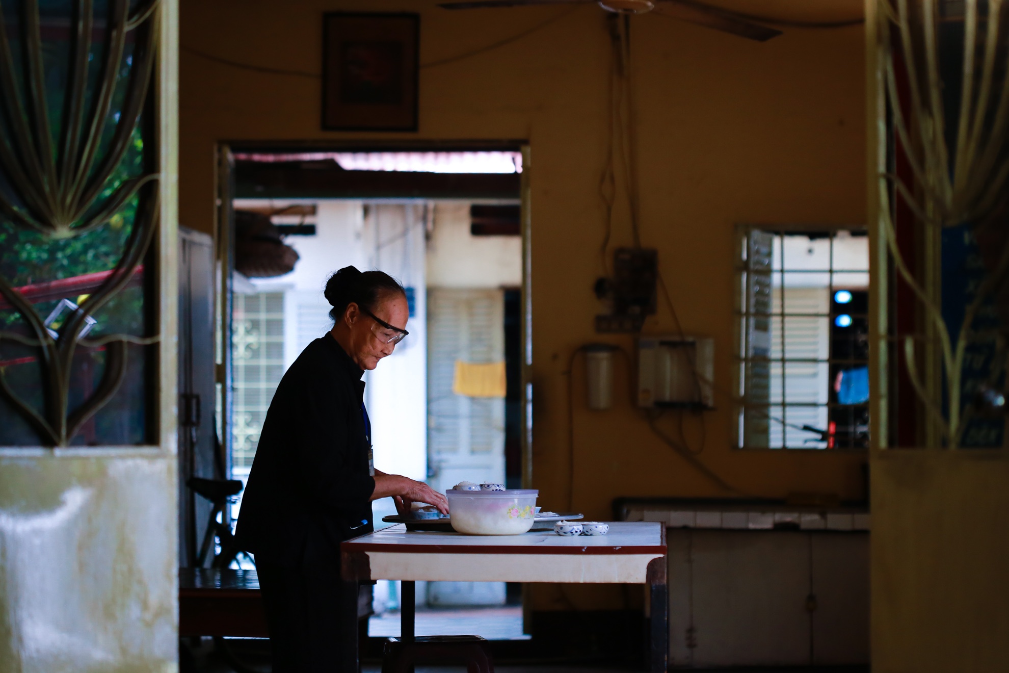 | Ngược với kép hề Lý Lắc luôn vui vẻ trò chuyện thì nghệ sĩ Nhật Sinh lại muốn sống khép lòng. Hôm nay, một nhóm bạn trẻ kịch Cầu Vồng (quận 10) ghé thăm trò chuyện. Ông chân tình chia sẻ: "Giờ đã mang tiếng ăn bám ở chùa thì nói chuyện thời hoàng kim làm chi cho xấu hổ. Thôi thì cứ an phận làm công quả giúp chùa mà thôi". |