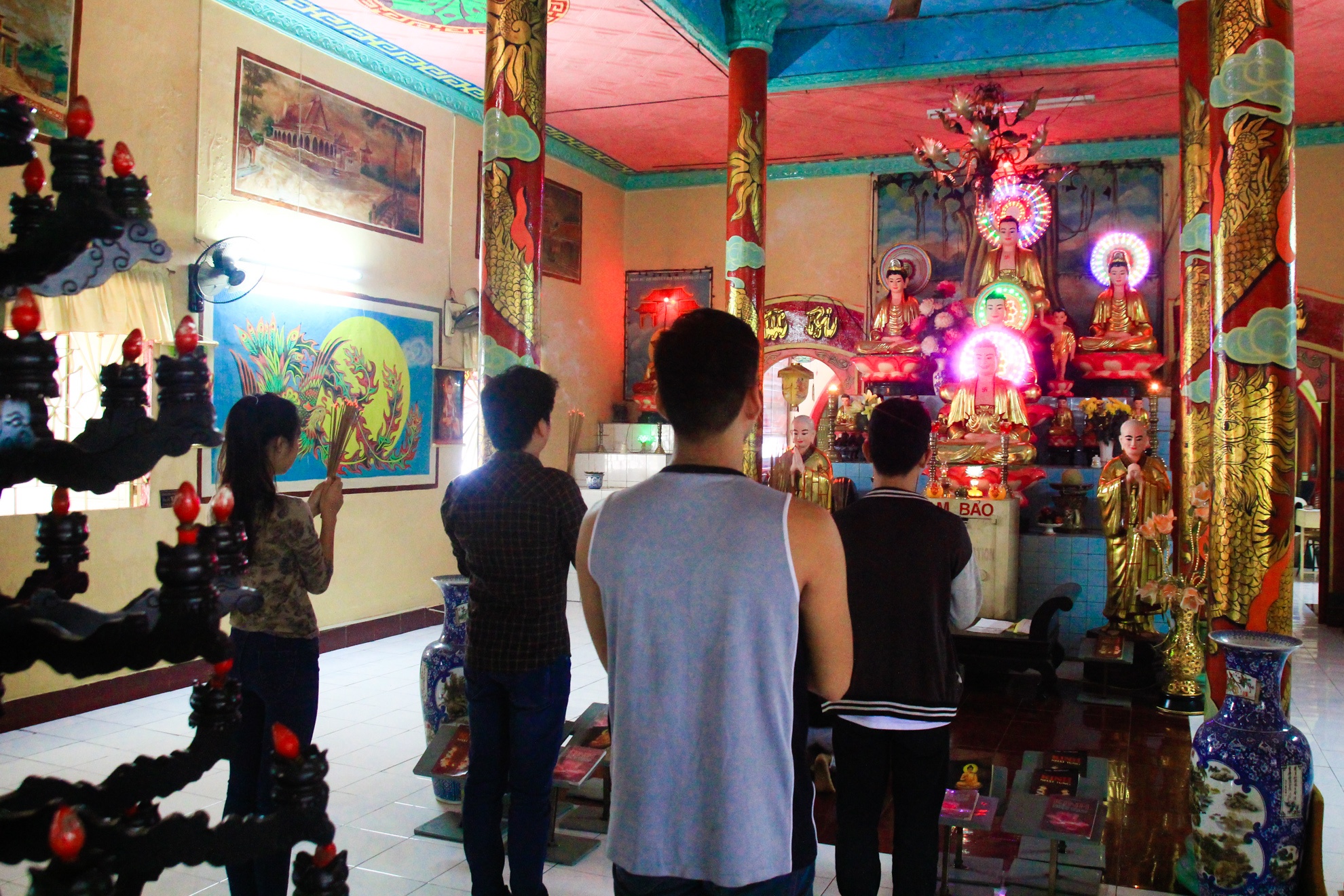 | Khách đến viếng ngoài bá tánh thập phương còn có các nhóm nhạc, kịch ghé thăm chùa cúng tổ. Họ cầu tổ nghề phù hộ cho thành công trong sự nghiệp. |
