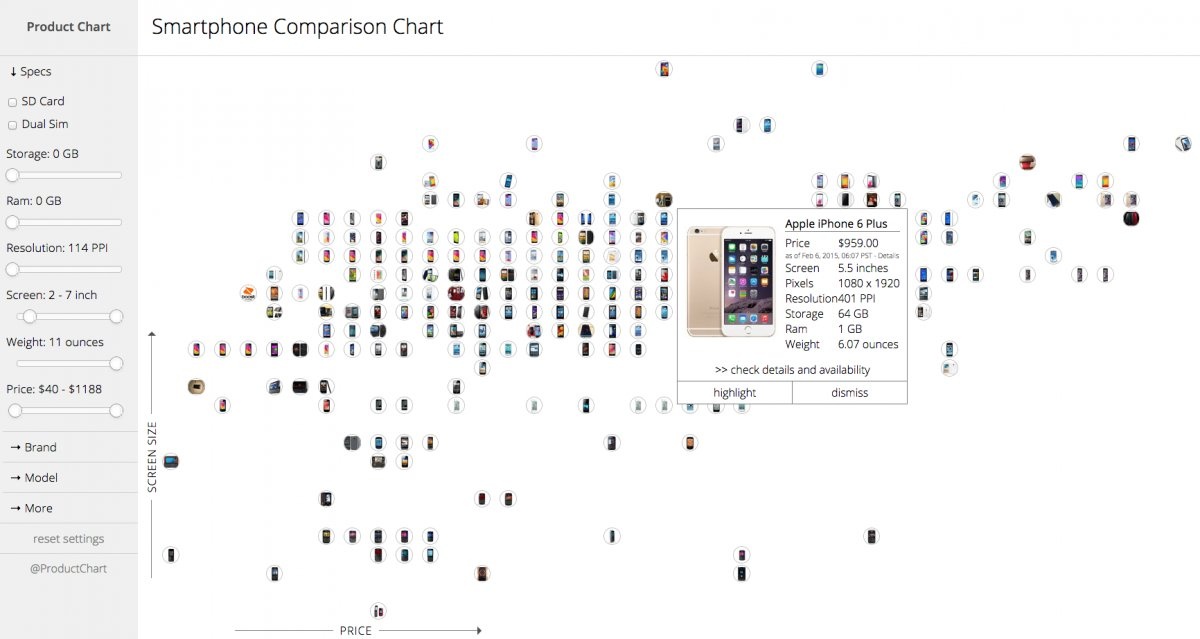 Giá của các thiết bị trong biểu đồ trên dựa vào giá niêm yết của chúng trên hệ thống bán lẻ trực tuyến Amazon và đều là phiên bản mở khóa (không bị ràng buộc hợp đồng). Một điều đáng tiếc là tiện ích này không có dữ liệu về dung lượng pin và hệ điều hành. Đây là hai thứ không thể thiếu trong tiêu chí lựa chọn sản phẩm của người tiêu dùng. Ngoài ra, Product Chart còn có một biểu đồ tương tự dành cho laptop. Xem thêm tại đây.