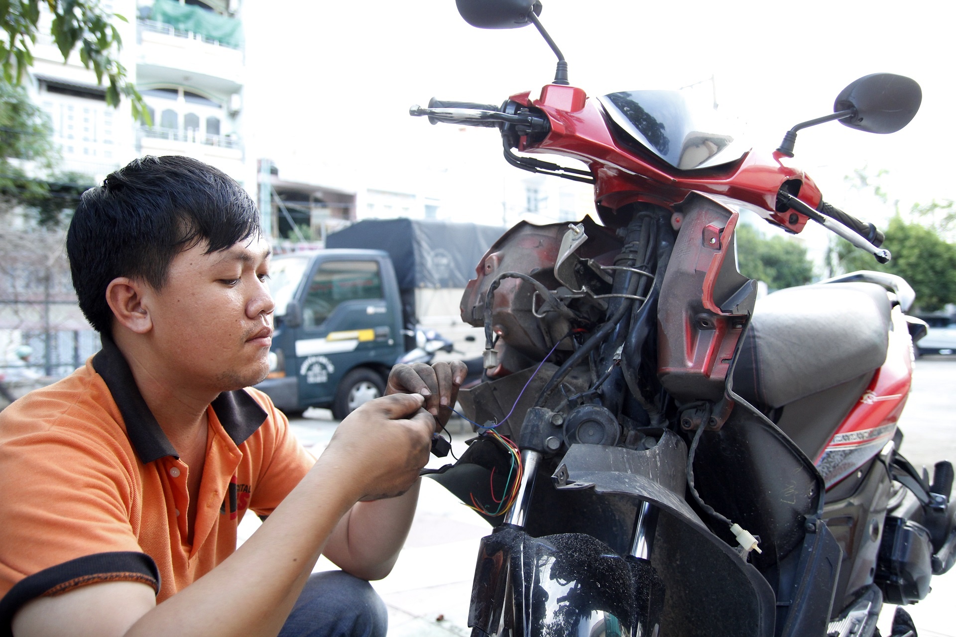 Để lắp đặt thiết bị này, bạn cần mở dàn mặt nạ trước để tìm thấy giắc cắm vào ổ khóa. Riêng dòng xe Nouvo 4 trong bài viết này không có giắc cắm nên kỹ thuật viên phải cắt sợi dây này để nối thiết bị.