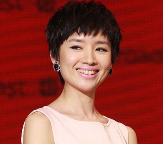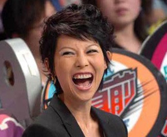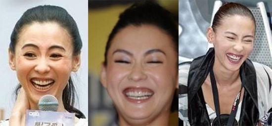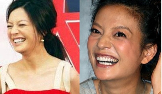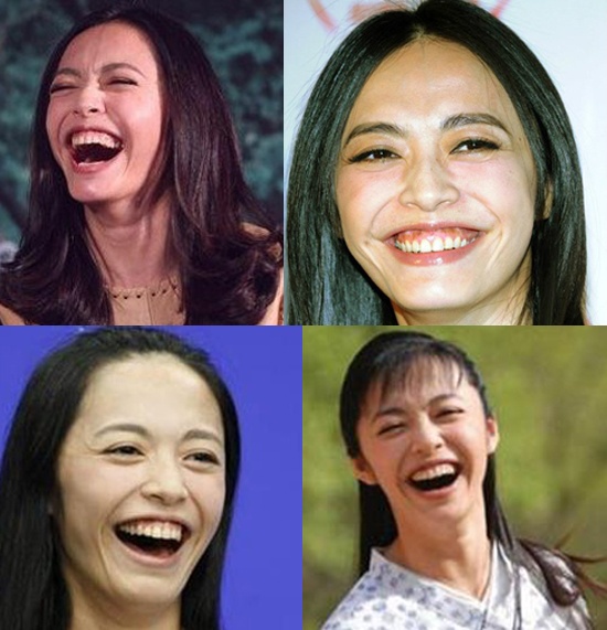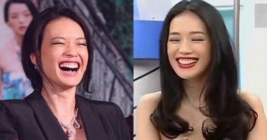 | Đổng Khiết đã lộ hàm răng bị ố vàng cùng vết chân chim trên mắt. |