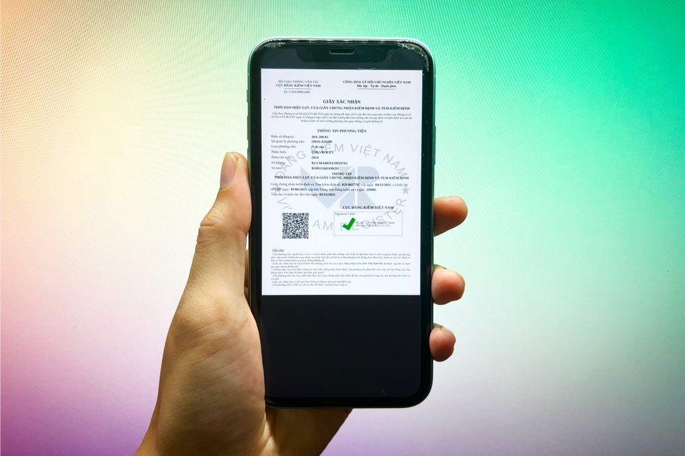 Giấy đăng kiểm điện tử thể hiện đầy đủ thông tin kiểm định của phương tiện, bao gồm mức khí thải đạt được theo quy định, thời hạn hiệu lực và các thông tin liên quan khác. Tài liệu này cũng đồng thời tích hợp mã QR liên kết tới bản thể hiện Giấy chứng nhận điện tử trên website của Cục Đăng kiểm, nhằm phục vụ việc kiểm tra, xác thực.