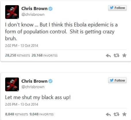 Theo Chris Brown thì loại virus nguy hiểm gây ra 4.000 cái chết tại Liberia, Sierra Leone và Guinea không phải là một sản phẩm của tự nhiên. Thay vào đó, anh cho rằng thảm họa Ebola vốn do chính con người tạo ra nhằm chống lại vấn nạn dân số toàn cầu tăng cao.