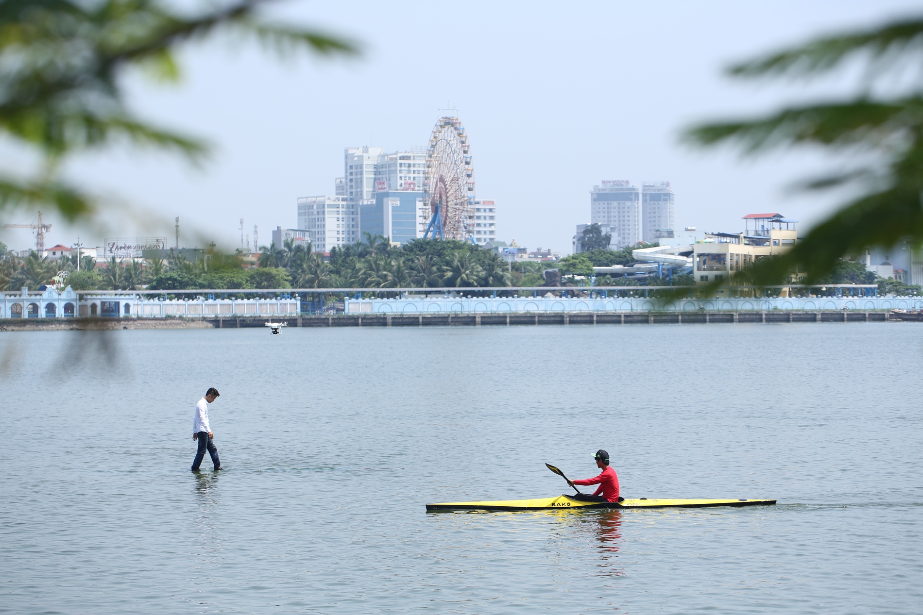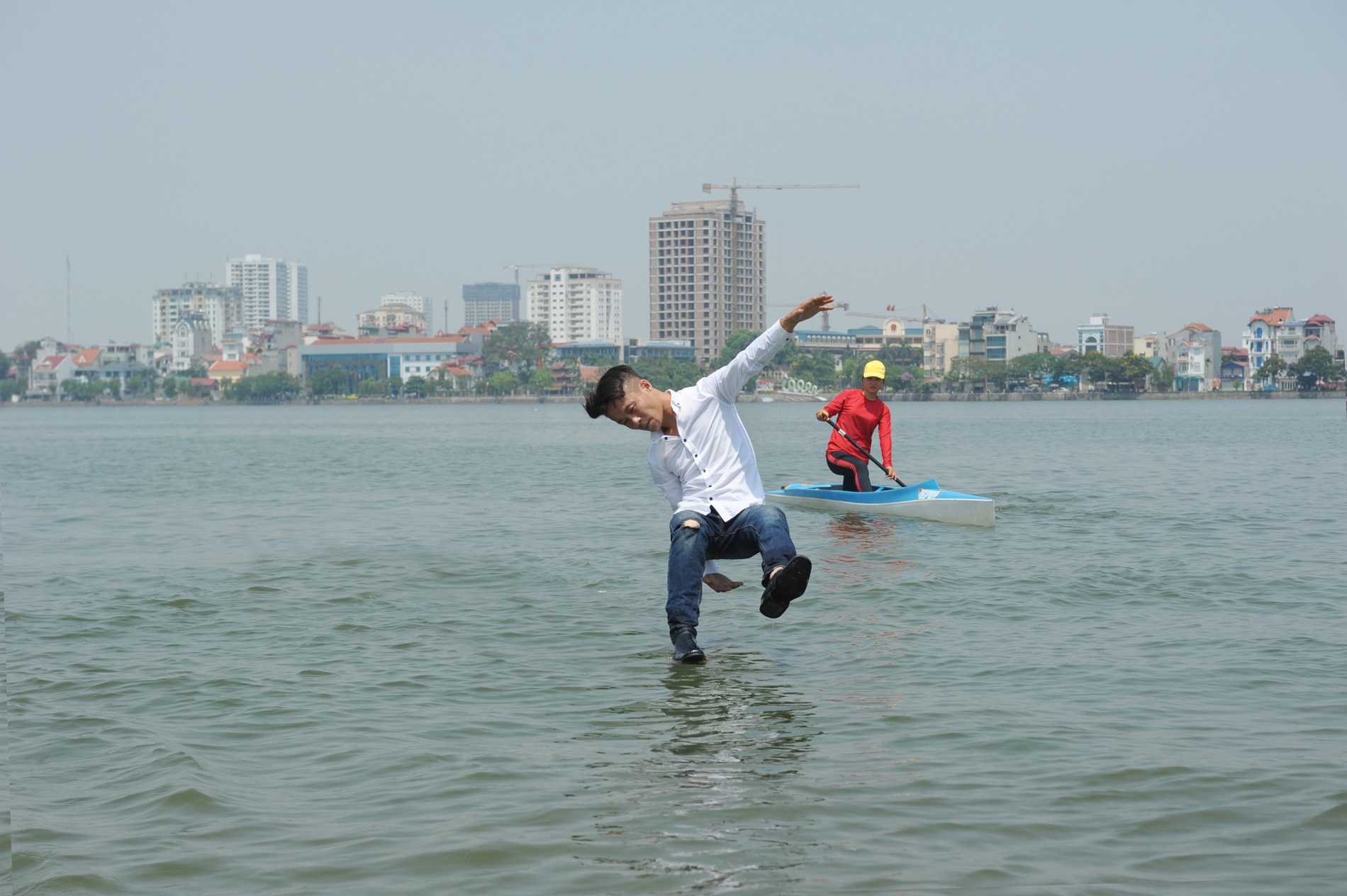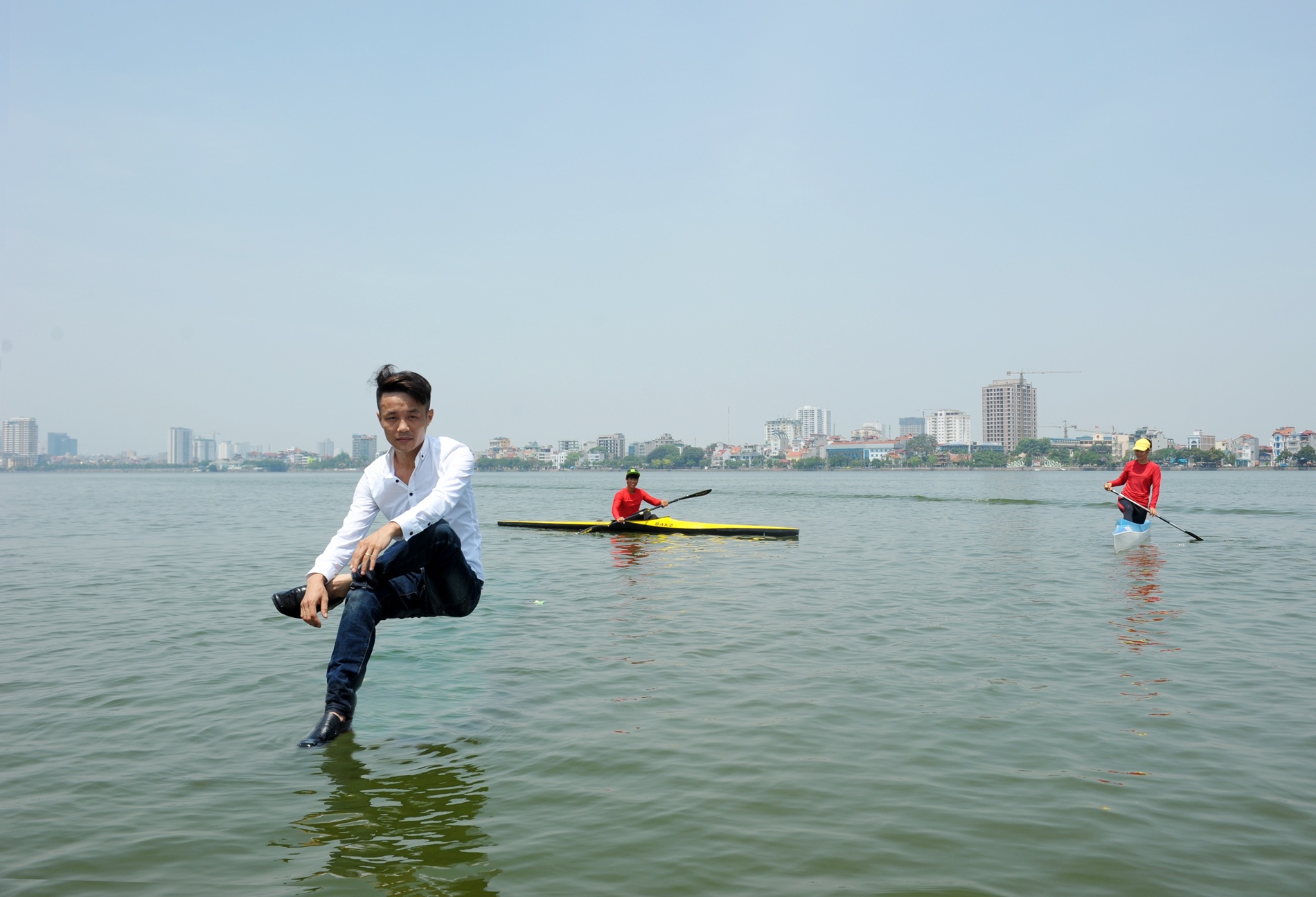 | Trần Đình Quý ngồi lên thuyền ra xa cách bờ khoảng 100 m để thể hiện. Bước chân của anh cho thấy có vẻ như không có vật gì ở dưới mặt nước. |