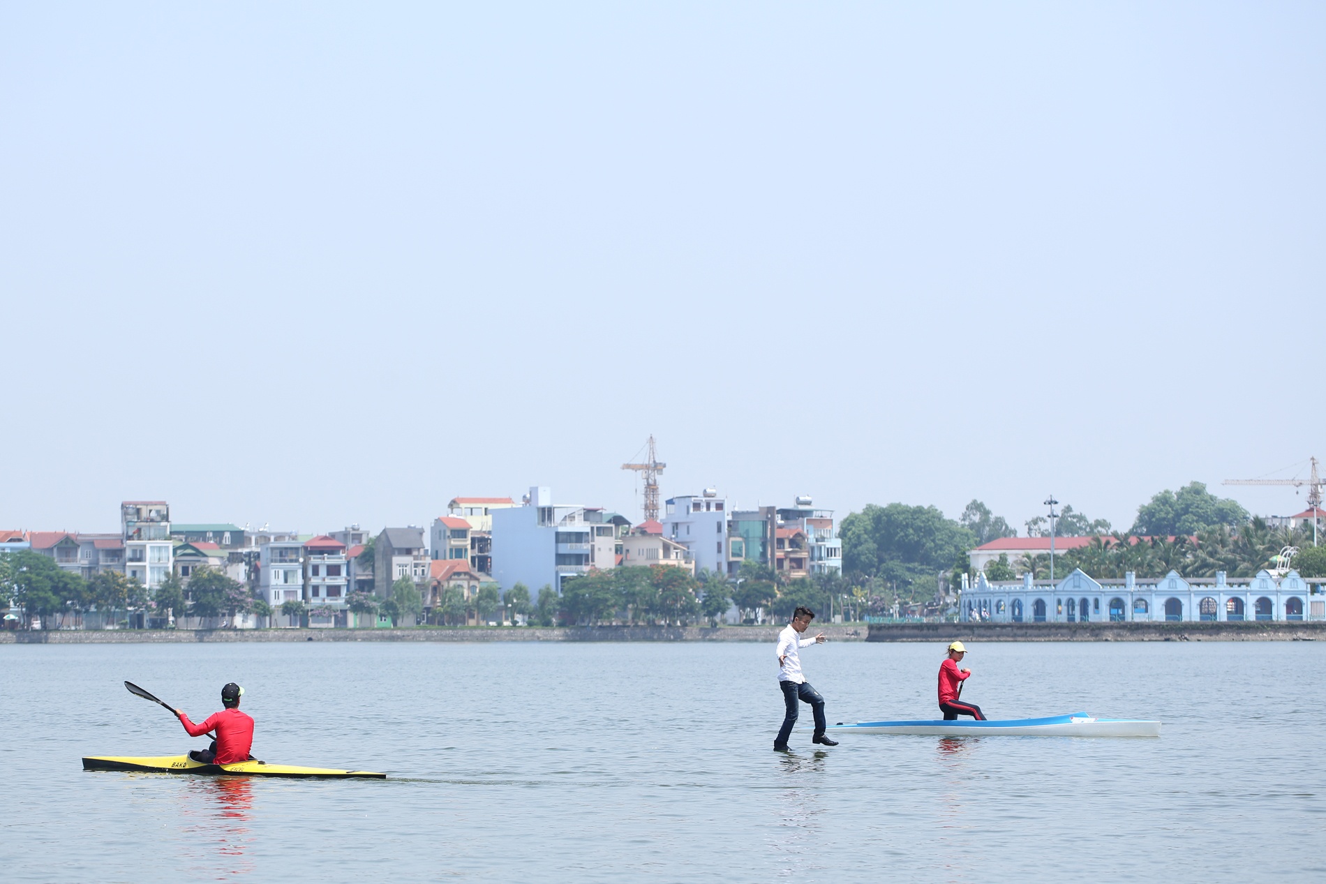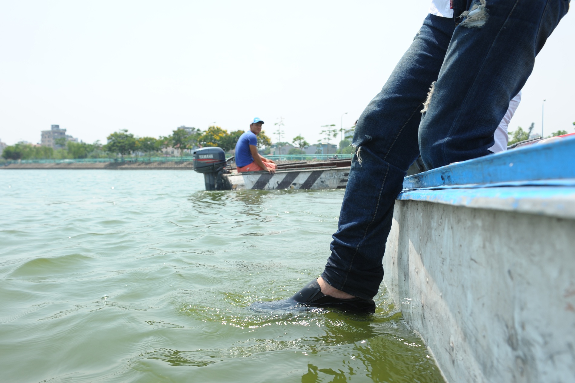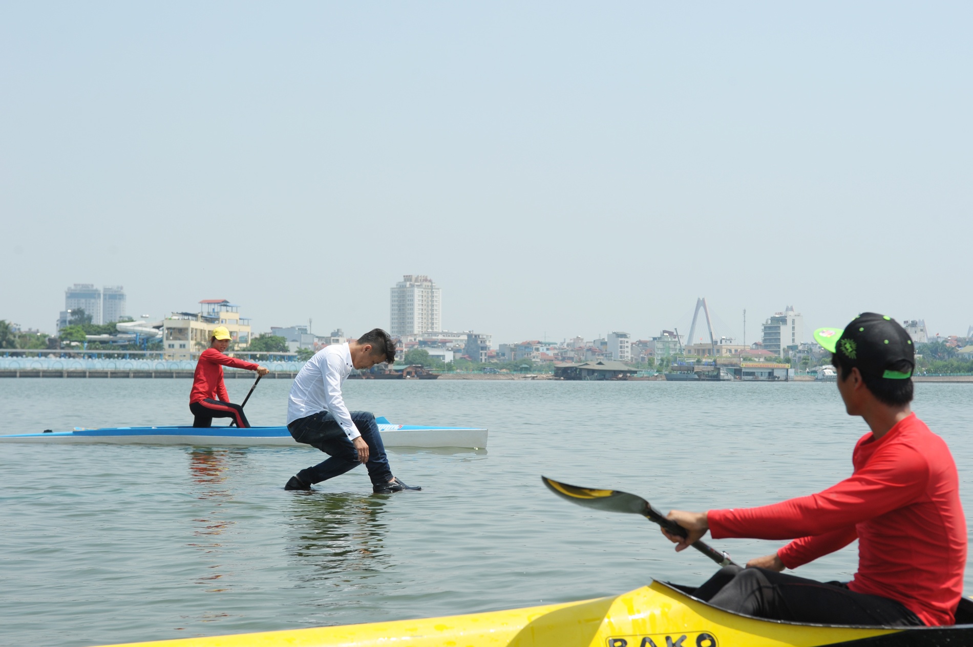 | Trần Đình Quý ngồi lên thuyền ra xa cách bờ khoảng 100 m để thể hiện. Bước chân của anh cho thấy có vẻ như không có vật gì ở dưới mặt nước. |