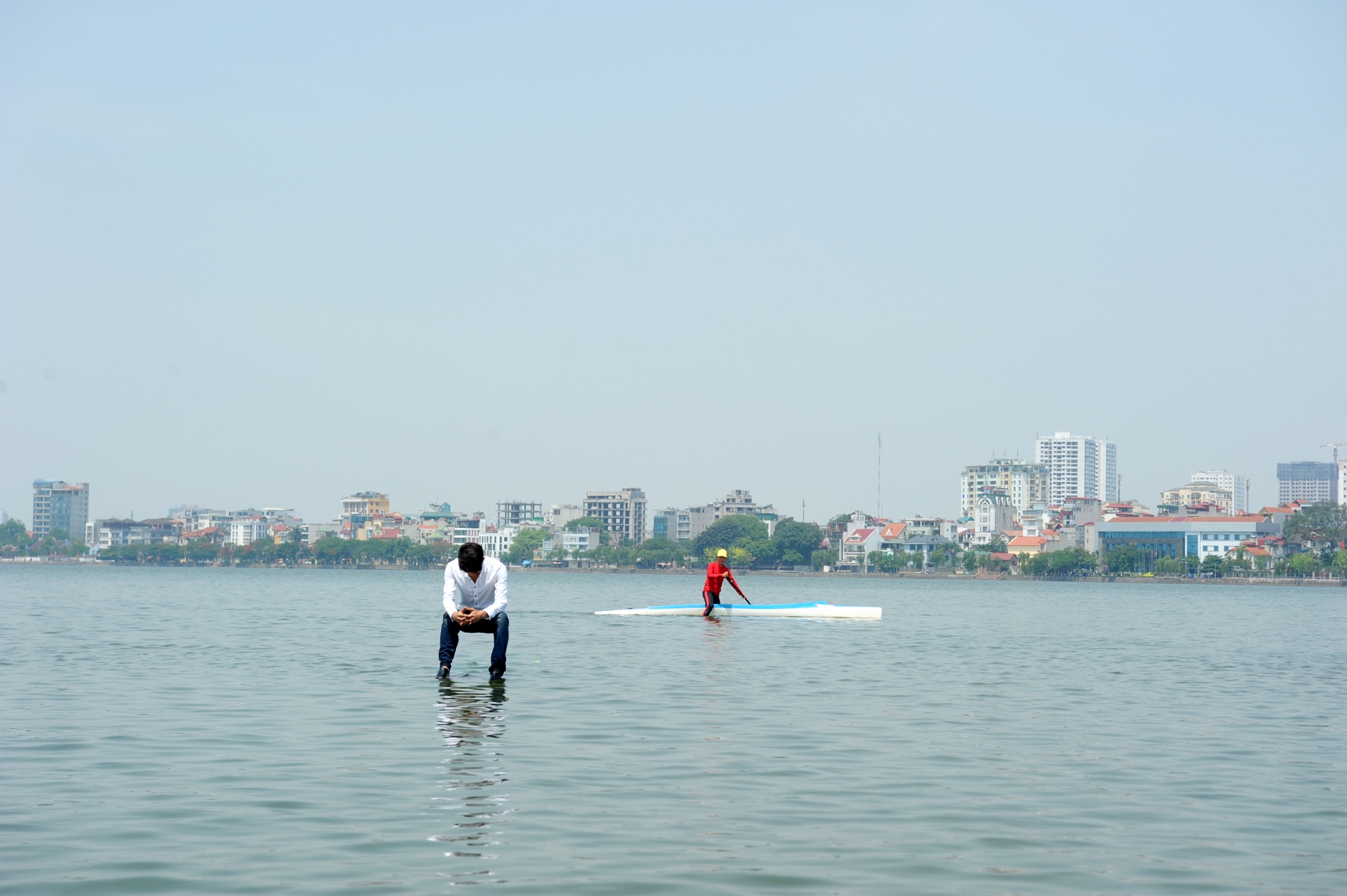 | Buổi trình diễn đi bộ và ngồi lơ lửng trên mặt nước của ảo thuật gia trẻ Trần Đình Quý lúc 10h ngày 26/5 trên hồ Tây (Hà Nội). Ngoài nhân vật chính còn có sự trợ giúp của ê kíp khoảng 7 người. |